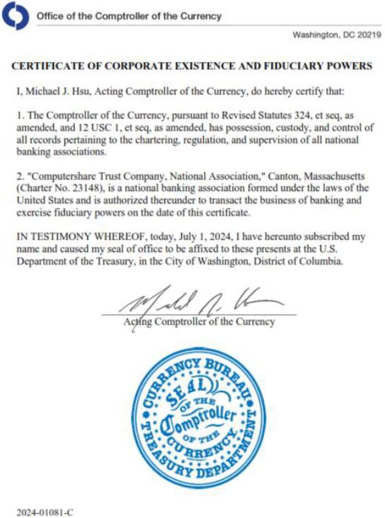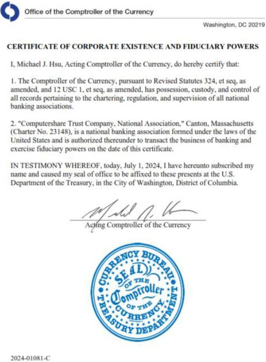 A copy of the Comptroller of the Currency Certification of Fiduciary Powers for Computershare Trust Company, National Association, dated July 1, 2024.