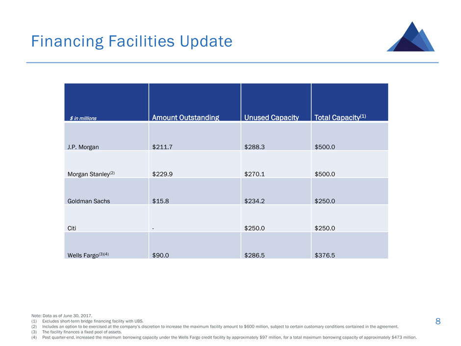 (4) Post quarter-end, increased the maximum borrowing capacity under the Wells Fargo credit facility by approximately $97 million, for a total maximum borrowing capacity of approximately $473 million.