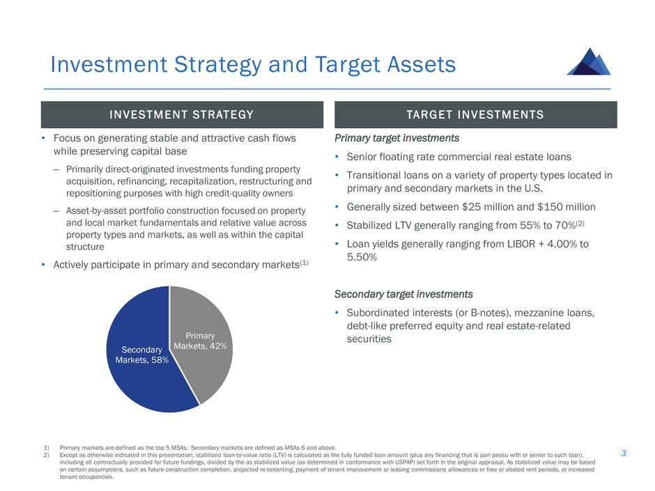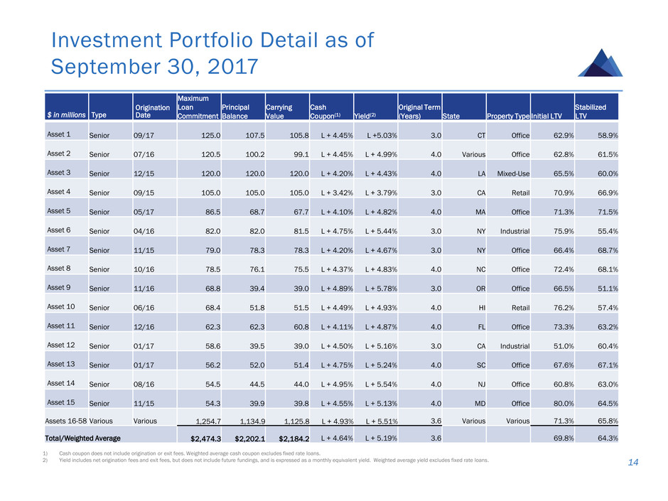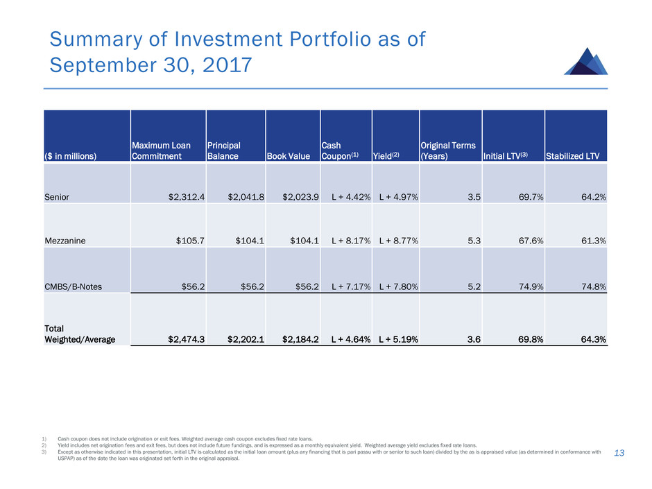2) Except as otherwise indicated in this presentation, stabilized loan-to-value ratio (LTV) is calculated as the fully funded loan amount (plus any financing that is pari passu with or senior to such loan),