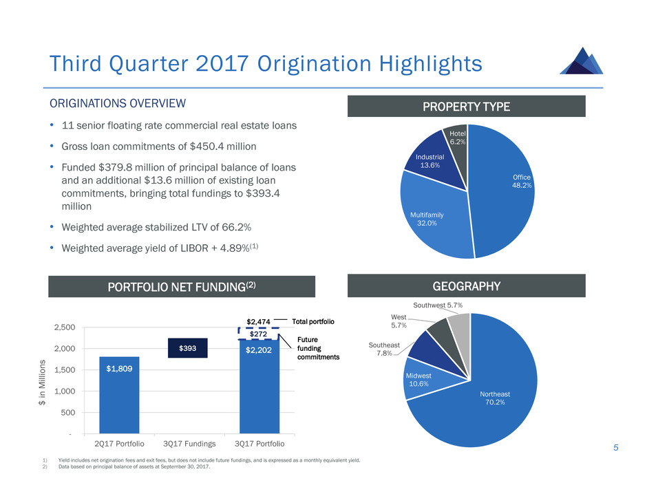 • Closed 11 senior floating rate commercial real estate loans with total commitments of approximately $450.4 million