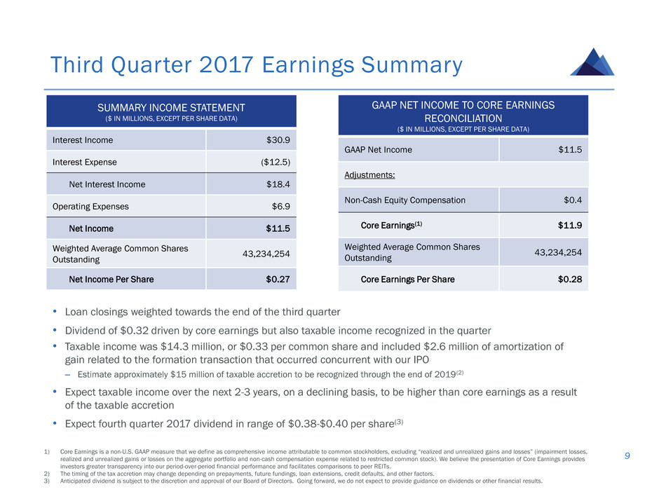 • Delivered GAAP net income of $11.5 million or $0.27 per common share; Core Earnings of $11.9 million or $0.28 per