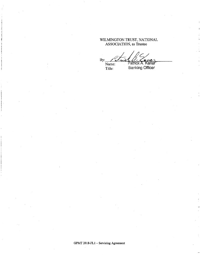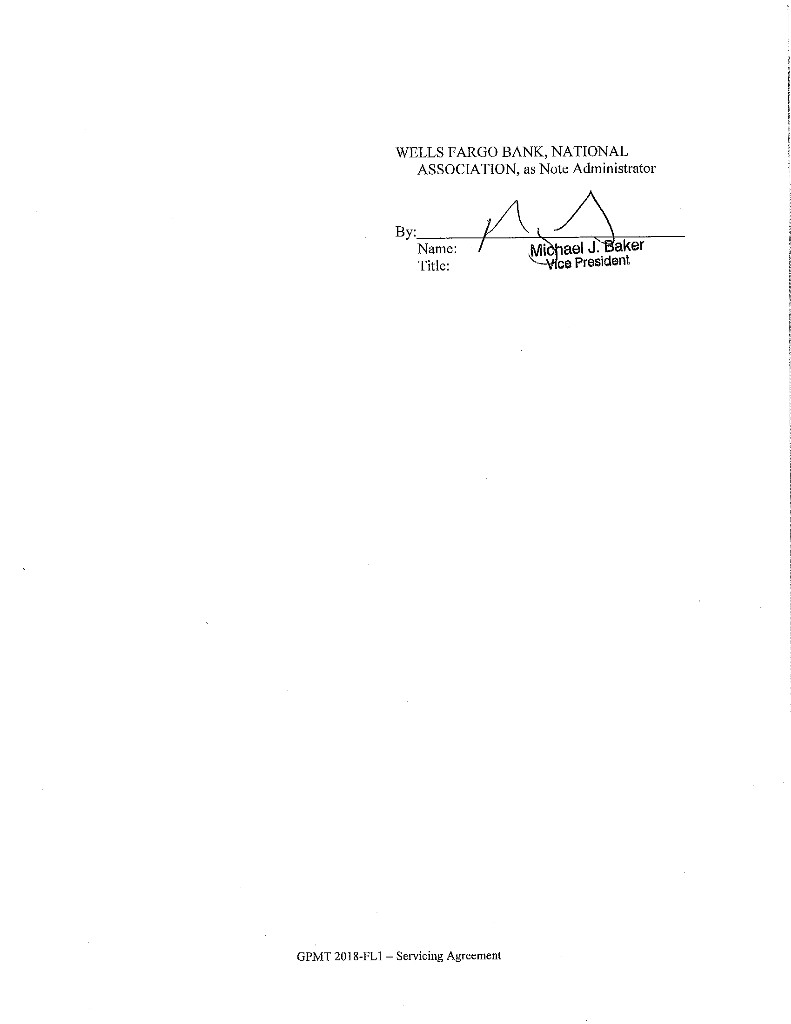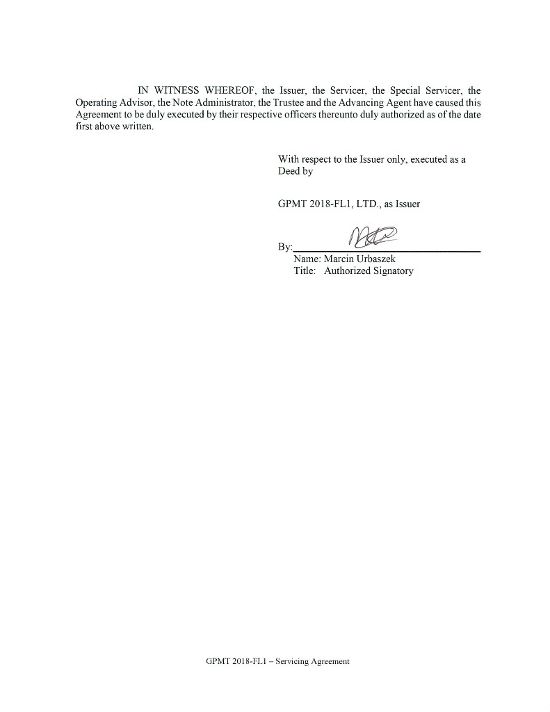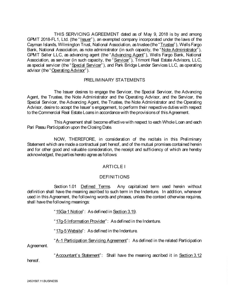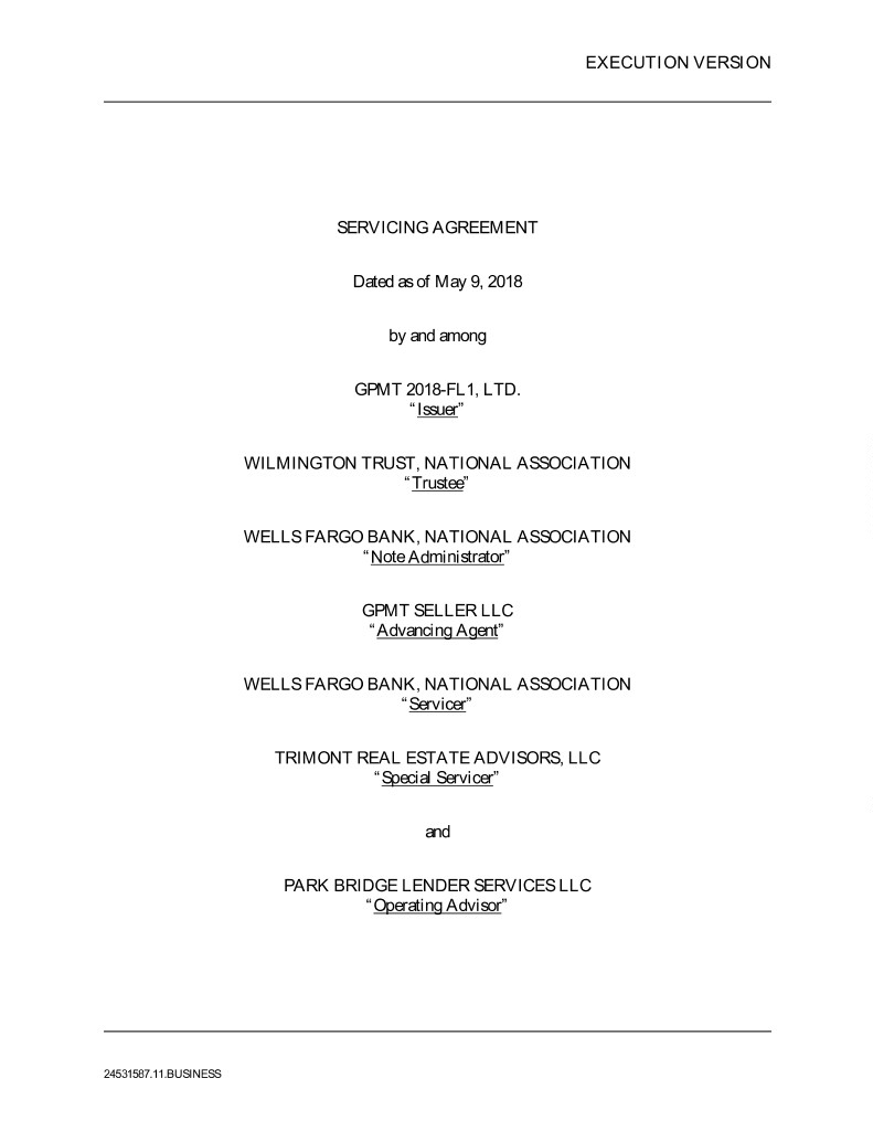 THIS SERVICING AGREEMENT dated as of May 9, 2018 is by and among GPMT 2018-FL1, Ltd. (the “Issuer”), an exempted company incorporated under the laws of the Cayman Islands, Wilmington Trust, National Association, as trustee (the “Trustee”), Wells Fargo Bank, National Association, as note administrator (in such capacity, the “Note Administrator”), GPMT Seller LLC, as advancing agent (the “Advancing Agent”), Wells Fargo Bank, National Association, as servicer (in such capacity, the “Servicer”), Trimont Real Estate Advisors, LLC, as special servicer (the “Special Servicer”), and Park Bridge Lender Services LLC, as operating advisor (the “Operating Advisor”). PRELIMINARY STATEMENTS The Issuer desires to engage the Servicer, the Special Servicer, the Advancing Agent, the Trustee, the Note Administrator and the Operating Advisor, and the Servicer, the Special Servicer, the Advancing Agent, the Trustee, the Note Administrator and the Operating Advisor, desire to accept the Issuer’s engagement, to perform their respective duties with respect to the Commercial Real Estate Loans in accordance with the provisions of this Agreement. This Agreement shall become effective with respect to each Whole Loan and each Pari Passu Participation upon the Closing Date. NOW, THEREFORE, in consideration of the recitals in this Preliminary Statement which are made a contractual part hereof, and of the mutual promises contained herein and for other good and valuable consideration, the receipt and sufficiency of which are hereby acknowledged, the parties hereto agree as follows: ARTICLE I DEFINITIONS Section 1.01 Defined Terms. Any capitalized term used herein without definition shall have the meaning ascribed to such term in the Indenture. In addition, whenever used in this Agreement, the following words and phrases, unless the context otherwise requires, shall have the following meanings: “15Ga-1 Notice”: As defined in Section 3.19. “17g-5 Information Provider”: As defined in the Indenture. “17g-5 Website”: As defined in the Indenture. “A-1 Participation Servicing Agreement”: As defined in the related Participation Agreement. “Accountant’s Statement”: Shall have the meaning ascribed it in Section 3.12 hereof. 24531587.11.BUSINESS