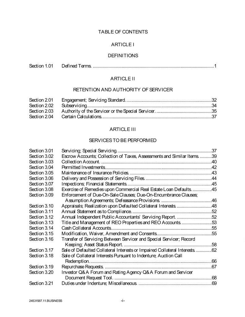 TABLE OF CONTENTS ARTICLE I DEFINITIONS Section 1.01 Defined Terms. .....................................................................................................1 ARTICLE II RETENTION AND AUTHORITY OF SERVICER Section 2.01 Engagement; Servicing Standard........................................................................32 Section 2.02 Subservicing........................................................................................................34 Section 2.03 Authority of the Servicer or the Special Servicer. ..............................................35 Section 2.04 Certain Calculations............................................................................................37 ARTICLE III SERVICES TO BE PERFORMED Section 3.01 Servicing; Special Servicing...............................................................................37 Section 3.02 Escrow Accounts; Collection of Taxes, Assessments and Similar Items...........39 Section 3.03 Collection Account. ............................................................................................40 Section 3.04 Permitted Investments.........................................................................................42 Section 3.05 Maintenance of Insurance Policies. ....................................................................43 Section 3.06 Delivery and Possession of Servicing Files........................................................44 Section 3.07 Inspections; Financial Statements.......................................................................45 Section 3.08 Exercise of Remedies upon Commercial Real Estate Loan Defaults. ................45 Section 3.09 Enforcement of Due-On-Sale Clauses; Due-On-Encumbrance Clauses; Assumption Agreements; Defeasance Provisions. ..........................................46 Section 3.10 Appraisals; Realization upon Defaulted Collateral Interests..............................48 Section 3.11 Annual Statement as to Compliance...................................................................52 Section 3.12 Annual Independent Public Accountants’ Servicing Report. .............................52 Section 3.13 Title and Management of REO Properties and REO Accounts..........................53 Section 3.14 Cash Collateral Accounts....................................................................................55 Section 3.15 Modification, Waiver, Amendment and Consents..............................................55 Section 3.16 Transfer of Servicing Between Servicer and Special Servicer; Record Keeping; Asset Status Report. .........................................................................58 Section 3.17 Sale of Defaulted Collateral Interests or Impaired Collateral Interests. .............62 Section 3.18 Sale of Collateral Interests Pursuant to Indenture; Auction Call Redemption......................................................................................................66 Section 3.19 Repurchase Requests. .........................................................................................67 Section 3.20 Investor Q&A Forum and Rating Agency Q&A Forum and Servicer Document Request Tool. .................................................................................68 Section 3.21 Duties under Indenture; Miscellaneous. .............................................................69 24531587.11.BUSINESS -i-