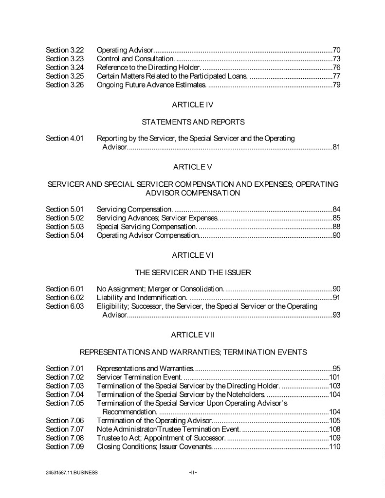 Section 3.22 Operating Advisor...............................................................................................70 Section 3.23 Control and Consultation. ...................................................................................73 Section 3.24 Reference to the Directing Holder. .....................................................................76 Section 3.25 Certain Matters Related to the Participated Loans. ............................................77 Section 3.26 Ongoing Future Advance Estimates. ..................................................................79 ARTICLE IV STATEMENTS AND REPORTS Section 4.01 Reporting by the Servicer, the Special Servicer and the Operating Advisor.............................................................................................................81 ARTICLE V SERVICER AND SPECIAL SERVICER COMPENSATION AND EXPENSES; OPERATING ADVISOR COMPENSATION Section 5.01 Servicing Compensation. ....................................................................................84 Section 5.02 Servicing Advances; Servicer Expenses.............................................................85 Section 5.03 Special Servicing Compensation. .......................................................................88 Section 5.04 Operating Advisor Compensation.......................................................................90 ARTICLE VI THE SERVICER AND THE ISSUER Section 6.01 No Assignment; Merger or Consolidation..........................................................90 Section 6.02 Liability and Indemnification. ............................................................................91 Section 6.03 Eligibility; Successor, the Servicer, the Special Servicer or the Operating Advisor.............................................................................................................93 ARTICLE VII REPRESENTATIONS AND WARRANTIES; TERMINATION EVENTS Section 7.01 Representations and Warranties..........................................................................95 Section 7.02 Servicer Termination Event. .............................................................................101 Section 7.03 Termination of the Special Servicer by the Directing Holder. .........................103 Section 7.04 Termination of the Special Servicer by the Noteholders..................................104 Section 7.05 Termination of the Special Servicer Upon Operating Advisor’s Recommendation. ..........................................................................................104 Section 7.06 Termination of the Operating Advisor..............................................................105 Section 7.07 Note Administrator/Trustee Termination Event. ..............................................108 Section 7.08 Trustee to Act; Appointment of Successor. ......................................................109 Section 7.09 Closing Conditions; Issuer Covenants..............................................................110 24531587.11.BUSINESS -ii-
