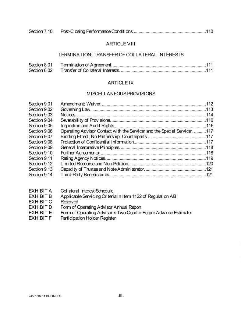 Section 7.10 Post-Closing Performance Conditions..............................................................110 ARTICLE VIII TERMINATION; TRANSFER OF COLLATERAL INTERESTS Section 8.01 Termination of Agreement................................................................................111 Section 8.02 Transfer of Collateral Interests. ........................................................................111 ARTICLE IX MISCELLANEOUS PROVISIONS Section 9.01 Amendment; Waiver.........................................................................................112 Section 9.02 Governing Law. ................................................................................................113 Section 9.03 Notices. .............................................................................................................114 Section 9.04 Severability of Provisions.................................................................................116 Section 9.05 Inspection and Audit Rights..............................................................................116 Section 9.06 Operating Advisor Contact with the Servicer and the Special Servicer. ..........117 Section 9.07 Binding Effect; No Partnership; Counterparts..................................................117 Section 9.08 Protection of Confidential Information.............................................................117 Section 9.09 General Interpretive Principles. ........................................................................118 Section 9.10 Further Agreements. .........................................................................................118 Section 9.11 Rating Agency Notices. ....................................................................................119 Section 9.12 Limited Recourse and Non-Petition..................................................................120 Section 9.13 Capacity of Trustee and Note Administrator....................................................121 Section 9.14 Third-Party Beneficiaries..................................................................................121 EXHIBIT A Collateral Interest Schedule EXHIBIT B Applicable Servicing Criteria in Item 1122 of Regulation AB EXHIBIT C Reserved EXHIBIT D Form of Operating Advisor Annual Report EXHIBIT E Form of Operating Advisor’s Two Quarter Future Advance Estimate EXHIBIT F Participation Holder Register 24531587.11.BUSINESS -iii-