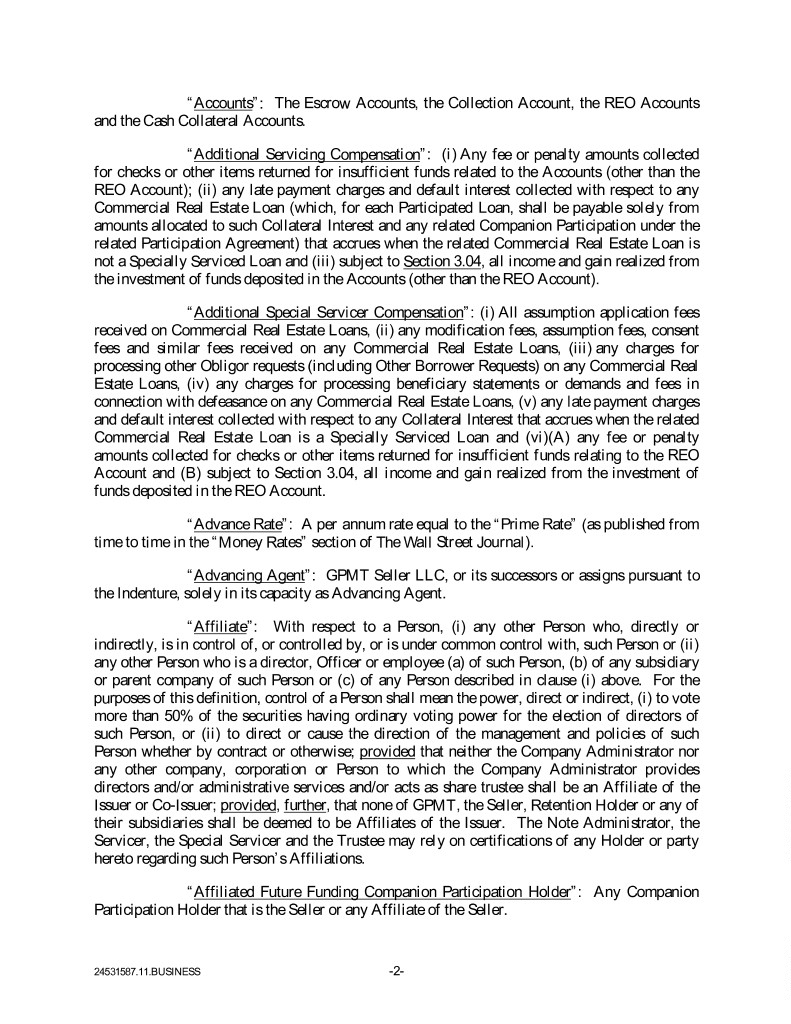 “Accounts”: The Escrow Accounts, the Collection Account, the REO Accounts and the Cash Collateral Accounts. “Additional Servicing Compensation”: (i) Any fee or penalty amounts collected for checks or other items returned for insufficient funds related to the Accounts (other than the REO Account); (ii) any late payment charges and default interest collected with respect to any Commercial Real Estate Loan (which, for each Participated Loan, shall be payable solely from amounts allocated to such Collateral Interest and any related Companion Participation under the related Participation Agreement) that accrues when the related Commercial Real Estate Loan is not a Specially Serviced Loan and (iii) subject to Section 3.04, all income and gain realized from the investment of funds deposited in the Accounts (other than the REO Account). “Additional Special Servicer Compensation”: (i) All assumption application fees received on Commercial Real Estate Loans, (ii) any modification fees, assumption fees, consent fees and similar fees received on any Commercial Real Estate Loans, (iii) any charges for processing other Obligor requests (including Other Borrower Requests) on any Commercial Real Estate Loans, (iv) any charges for processing beneficiary statements or demands and fees in connection with defeasance on any Commercial Real Estate Loans, (v) any late payment charges and default interest collected with respect to any Collateral Interest that accrues when the related Commercial Real Estate Loan is a Specially Serviced Loan and (vi)(A) any fee or penalty amounts collected for checks or other items returned for insufficient funds relating to the REO Account and (B) subject to Section 3.04, all income and gain realized from the investment of funds deposited in the REO Account. “Advance Rate”: A per annum rate equal to the “Prime Rate” (as published from time to time in the “Money Rates” section of The Wall Street Journal). “Advancing Agent”: GPMT Seller LLC, or its successors or assigns pursuant to the Indenture, solely in its capacity as Advancing Agent. “Affiliate”: With respect to a Person, (i) any other Person who, directly or indirectly, is in control of, or controlled by, or is under common control with, such Person or (ii) any other Person who is a director, Officer or employee (a) of such Person, (b) of any subsidiary or parent company of such Person or (c) of any Person described in clause (i) above. For the purposes of this definition, control of a Person shall mean the power, direct or indirect, (i) to vote more than 50% of the securities having ordinary voting power for the election of directors of such Person, or (ii) to direct or cause the direction of the management and policies of such Person whether by contract or otherwise; provided that neither the Company Administrator nor any other company, corporation or Person to which the Company Administrator provides directors and/or administrative services and/or acts as share trustee shall be an Affiliate of the Issuer or Co-Issuer; provided, further, that none of GPMT, the Seller, Retention Holder or any of their subsidiaries shall be deemed to be Affiliates of the Issuer. The Note Administrator, the Servicer, the Special Servicer and the Trustee may rely on certifications of any Holder or party hereto regarding such Person’s Affiliations. “Affiliated Future Funding Companion Participation Holder”: Any Companion Participation Holder that is the Seller or any Affiliate of the Seller. 24531587.11.BUSINESS -2-