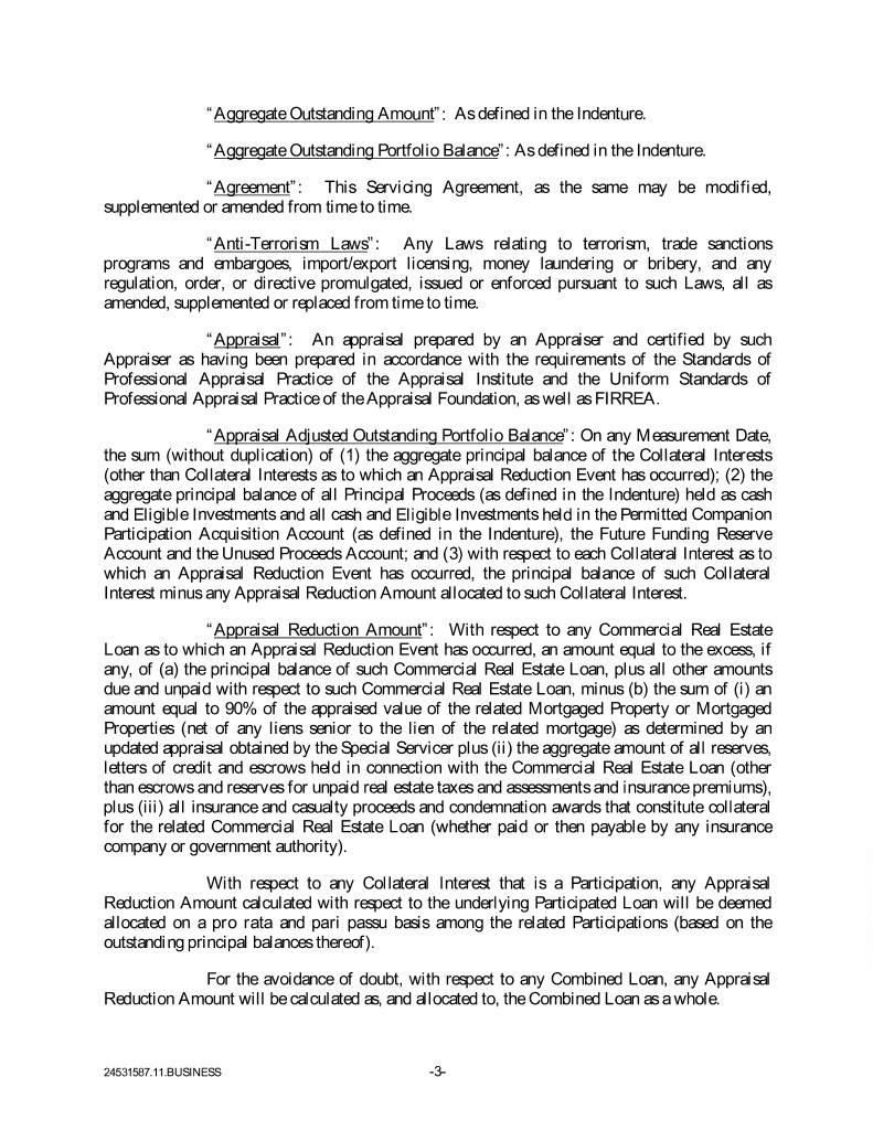 “Aggregate Outstanding Amount”: As defined in the Indenture. “Aggregate Outstanding Portfolio Balance”: As defined in the Indenture. “Agreement”: This Servicing Agreement, as the same may be modified, supplemented or amended from time to time. “Anti-Terrorism Laws”: Any Laws relating to terrorism, trade sanctions programs and embargoes, import/export licensing, money laundering or bribery, and any regulation, order, or directive promulgated, issued or enforced pursuant to such Laws, all as amended, supplemented or replaced from time to time. “Appraisal”: An appraisal prepared by an Appraiser and certified by such Appraiser as having been prepared in accordance with the requirements of the Standards of Professional Appraisal Practice of the Appraisal Institute and the Uniform Standards of Professional Appraisal Practice of the Appraisal Foundation, as well as FIRREA. “Appraisal Adjusted Outstanding Portfolio Balance”: On any Measurement Date, the sum (without duplication) of (1) the aggregate principal balance of the Collateral Interests (other than Collateral Interests as to which an Appraisal Reduction Event has occurred); (2) the aggregate principal balance of all Principal Proceeds (as defined in the Indenture) held as cash and Eligible Investments and all cash and Eligible Investments held in the Permitted Companion Participation Acquisition Account (as defined in the Indenture), the Future Funding Reserve Account and the Unused Proceeds Account; and (3) with respect to each Collateral Interest as to which an Appraisal Reduction Event has occurred, the principal balance of such Collateral Interest minus any Appraisal Reduction Amount allocated to such Collateral Interest. “Appraisal Reduction Amount”: With respect to any Commercial Real Estate Loan as to which an Appraisal Reduction Event has occurred, an amount equal to the excess, if any, of (a) the principal balance of such Commercial Real Estate Loan, plus all other amounts due and unpaid with respect to such Commercial Real Estate Loan, minus (b) the sum of (i) an amount equal to 90% of the appraised value of the related Mortgaged Property or Mortgaged Properties (net of any liens senior to the lien of the related mortgage) as determined by an updated appraisal obtained by the Special Servicer plus (ii) the aggregate amount of all reserves, letters of credit and escrows held in connection with the Commercial Real Estate Loan (other than escrows and reserves for unpaid real estate taxes and assessments and insurance premiums), plus (iii) all insurance and casualty proceeds and condemnation awards that constitute collateral for the related Commercial Real Estate Loan (whether paid or then payable by any insurance company or government authority). With respect to any Collateral Interest that is a Participation, any Appraisal Reduction Amount calculated with respect to the underlying Participated Loan will be deemed allocated on a pro rata and pari passu basis among the related Participations (based on the outstanding principal balances thereof). For the avoidance of doubt, with respect to any Combined Loan, any Appraisal Reduction Amount will be calculated as, and allocated to, the Combined Loan as a whole. 24531587.11.BUSINESS -3-