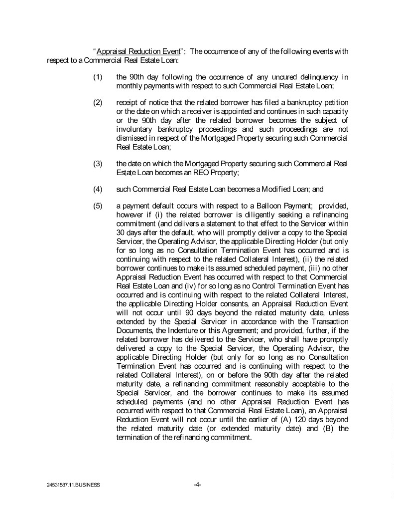 “Appraisal Reduction Event”: The occurrence of any of the following events with respect to a Commercial Real Estate Loan: (1) the 90th day following the occurrence of any uncured delinquency in monthly payments with respect to such Commercial Real Estate Loan; (2) receipt of notice that the related borrower has filed a bankruptcy petition or the date on which a receiver is appointed and continues in such capacity or the 90th day after the related borrower becomes the subject of involuntary bankruptcy proceedings and such proceedings are not dismissed in respect of the Mortgaged Property securing such Commercial Real Estate Loan; (3) the date on which the Mortgaged Property securing such Commercial Real Estate Loan becomes an REO Property; (4) such Commercial Real Estate Loan becomes a Modified Loan; and (5) a payment default occurs with respect to a Balloon Payment; provided, however if (i) the related borrower is diligently seeking a refinancing commitment (and delivers a statement to that effect to the Servicer within 30 days after the default, who will promptly deliver a copy to the Special Servicer, the Operating Advisor, the applicable Directing Holder (but only for so long as no Consultation Termination Event has occurred and is continuing with respect to the related Collateral Interest), (ii) the related borrower continues to make its assumed scheduled payment, (iii) no other Appraisal Reduction Event has occurred with respect to that Commercial Real Estate Loan and (iv) for so long as no Control Termination Event has occurred and is continuing with respect to the related Collateral Interest, the applicable Directing Holder consents, an Appraisal Reduction Event will not occur until 90 days beyond the related maturity date, unless extended by the Special Servicer in accordance with the Transaction Documents, the Indenture or this Agreement; and provided, further, if the related borrower has delivered to the Servicer, who shall have promptly delivered a copy to the Special Servicer, the Operating Advisor, the applicable Directing Holder (but only for so long as no Consultation Termination Event has occurred and is continuing with respect to the related Collateral Interest), on or before the 90th day after the related maturity date, a refinancing commitment reasonably acceptable to the Special Servicer, and the borrower continues to make its assumed scheduled payments (and no other Appraisal Reduction Event has occurred with respect to that Commercial Real Estate Loan), an Appraisal Reduction Event will not occur until the earlier of (A) 120 days beyond the related maturity date (or extended maturity date) and (B) the termination of the refinancing commitment. 24531587.11.BUSINESS -4-