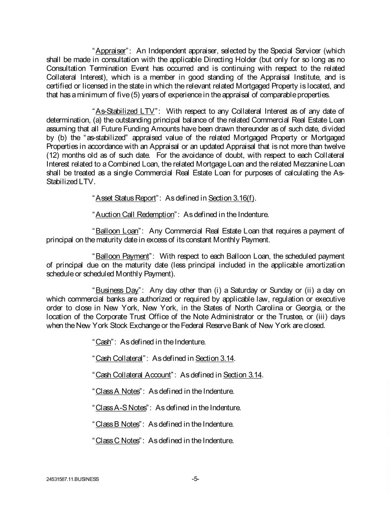 “Appraiser”: An Independent appraiser, selected by the Special Servicer (which shall be made in consultation with the applicable Directing Holder (but only for so long as no Consultation Termination Event has occurred and is continuing with respect to the related Collateral Interest), which is a member in good standing of the Appraisal Institute, and is certified or licensed in the state in which the relevant related Mortgaged Property is located, and that has a minimum of five (5) years of experience in the appraisal of comparable properties. “As-Stabilized LTV”: With respect to any Collateral Interest as of any date of determination, (a) the outstanding principal balance of the related Commercial Real Estate Loan assuming that all Future Funding Amounts have been drawn thereunder as of such date, divided by (b) the “as-stabilized” appraised value of the related Mortgaged Property or Mortgaged Properties in accordance with an Appraisal or an updated Appraisal that is not more than twelve (12) months old as of such date. For the avoidance of doubt, with respect to each Collateral Interest related to a Combined Loan, the related Mortgage Loan and the related Mezzanine Loan shall be treated as a single Commercial Real Estate Loan for purposes of calculating the As- Stabilized LTV. “Asset Status Report”: As defined in Section 3.16(f). “Auction Call Redemption”: As defined in the Indenture. “Balloon Loan”: Any Commercial Real Estate Loan that requires a payment of principal on the maturity date in excess of its constant Monthly Payment. “Balloon Payment”: With respect to each Balloon Loan, the scheduled payment of principal due on the maturity date (less principal included in the applicable amortization schedule or scheduled Monthly Payment). “Business Day”: Any day other than (i) a Saturday or Sunday or (ii) a day on which commercial banks are authorized or required by applicable law, regulation or executive order to close in New York, New York, in the States of North Carolina or Georgia, or the location of the Corporate Trust Office of the Note Administrator or the Trustee, or (iii) days when the New York Stock Exchange or the Federal Reserve Bank of New York are closed. “Cash”: As defined in the Indenture. “Cash Collateral”: As defined in Section 3.14. “Cash Collateral Account”: As defined in Section 3.14. “Class A Notes”: As defined in the Indenture. “Class A-S Notes”: As defined in the Indenture. “Class B Notes”: As defined in the Indenture. “Class C Notes”: As defined in the Indenture. 24531587.11.BUSINESS -5-