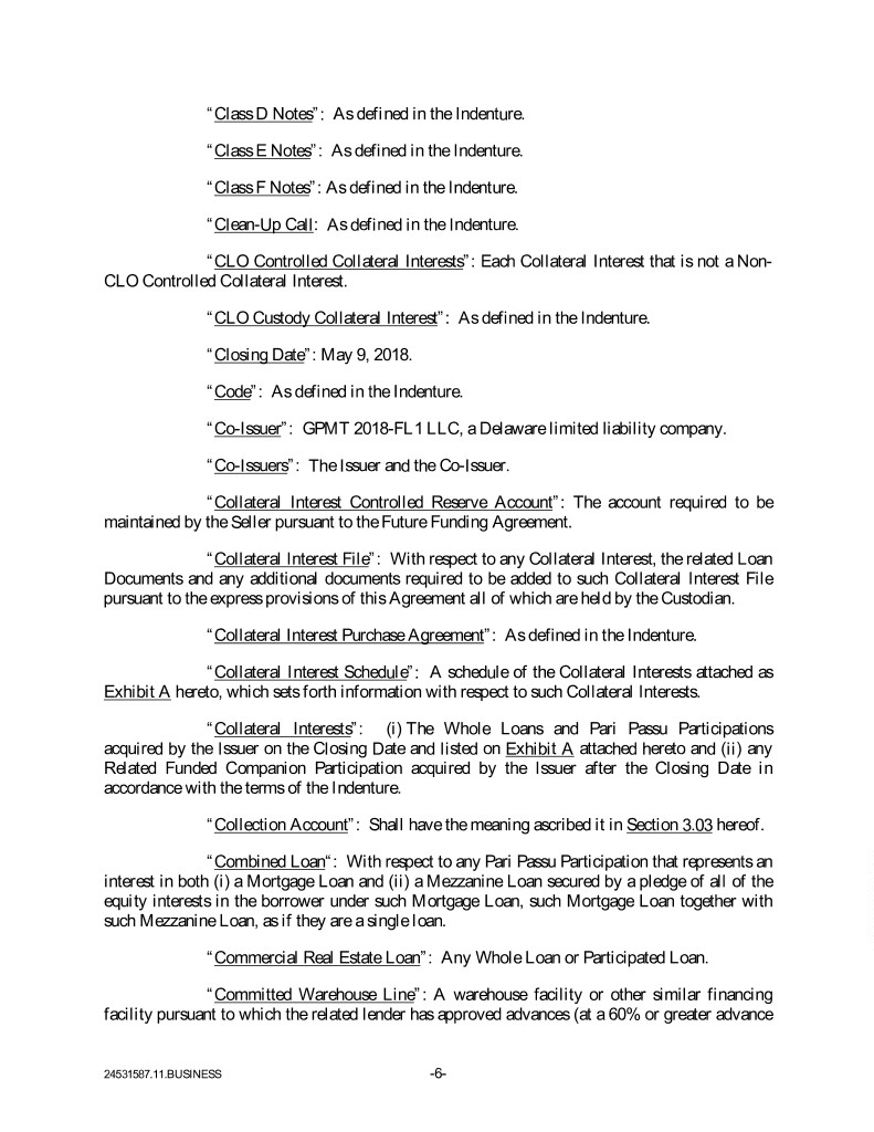 “Class D Notes”: As defined in the Indenture. “Class E Notes”: As defined in the Indenture. “Class F Notes”: As defined in the Indenture. “Clean-Up Call: As defined in the Indenture. “CLO Controlled Collateral Interests”: Each Collateral Interest that is not a Non- CLO Controlled Collateral Interest. “CLO Custody Collateral Interest”: As defined in the Indenture. “Closing Date”: May 9, 2018. “Code”: As defined in the Indenture. “Co-Issuer”: GPMT 2018-FL1 LLC, a Delaware limited liability company. “Co-Issuers”: The Issuer and the Co-Issuer. “Collateral Interest Controlled Reserve Account”: The account required to be maintained by the Seller pursuant to the Future Funding Agreement. “Collateral Interest File”: With respect to any Collateral Interest, the related Loan Documents and any additional documents required to be added to such Collateral Interest File pursuant to the express provisions of this Agreement all of which are held by the Custodian. “Collateral Interest Purchase Agreement”: As defined in the Indenture. “Collateral Interest Schedule”: A schedule of the Collateral Interests attached as Exhibit A hereto, which sets forth information with respect to such Collateral Interests. “Collateral Interests”: (i) The Whole Loans and Pari Passu Participations acquired by the Issuer on the Closing Date and listed on Exhibit A attached hereto and (ii) any Related Funded Companion Participation acquired by the Issuer after the Closing Date in accordance with the terms of the Indenture. “Collection Account”: Shall have the meaning ascribed it in Section 3.03 hereof. “Combined Loan“: With respect to any Pari Passu Participation that represents an interest in both (i) a Mortgage Loan and (ii) a Mezzanine Loan secured by a pledge of all of the equity interests in the borrower under such Mortgage Loan, such Mortgage Loan together with such Mezzanine Loan, as if they are a single loan. “Commercial Real Estate Loan”: Any Whole Loan or Participated Loan. “Committed Warehouse Line”: A warehouse facility or other similar financing facility pursuant to which the related lender has approved advances (at a 60% or greater advance 24531587.11.BUSINESS -6-