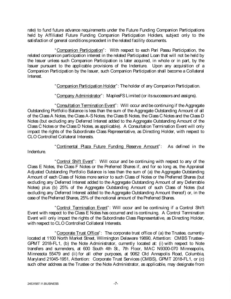 rate) to fund future advance requirements under the Future Funding Companion Participations held by Affiliated Future Funding Companion Participation Holders, subject only to the satisfaction of general conditions precedent in the related facility documents. “Companion Participation”: With respect to each Pari Passu Participation, the related companion participation interest in the related Participated Loan that will not be held by the Issuer unless such Companion Participation is later acquired, in whole or in part, by the Issuer pursuant to the applicable provisions of the Indenture. Upon any acquisition of a Companion Participation by the Issuer, such Companion Participation shall become a Collateral Interest. “Companion Participation Holder”: The holder of any Companion Participation. “Company Administrator”: MaplesFS Limited (or its successors and assigns). “Consultation Termination Event”: Will occur and be continuing if the Aggregate Outstanding Portfolio Balance is less than the sum of the Aggregate Outstanding Amount of all of the Class A Notes, the Class A-S Notes, the Class B Notes, the Class C Notes and the Class D Notes (but excluding any Deferred Interest added to the Aggregate Outstanding Amount of the Class C Notes or the Class D Notes, as applicable). A Consultation Termination Event will only impact the rights of the Subordinate Class Representative, as Directing Holder, with respect to CLO Controlled Collateral Interests. “Continental Plaza Future Funding Reserve Amount”: As defined in the Indenture. “Control Shift Event”: Will occur and be continuing with respect to any of the Class E Notes, the Class F Notes or the Preferred Shares if, and for so long as, the Appraisal Adjusted Outstanding Portfolio Balance is less than the sum of (a) the Aggregate Outstanding Amount of each Class of Notes more senior to such Class of Notes or the Preferred Shares (but excluding any Deferred Interest added to the Aggregate Outstanding Amount of any Deferrable Notes) plus (b) 25% of the Aggregate Outstanding Amount of such Class of Notes (but excluding any Deferred Interest added to the Aggregate Outstanding Amount thereof) or, in the case of the Preferred Shares, 25% of the notional amount of the Preferred Shares. “Control Termination Event”: Will occur and be continuing if a Control Shift Event with respect to the Class E Notes has occurred and is continuing. A Control Termination Event will only impact the rights of the Subordinate Class Representative, as Directing Holder, with respect to CLO Controlled Collateral Interests. “Corporate Trust Office”: The corporate trust office of (a) the Trustee, currently located at 1100 North Market Street, Wilmington Delaware 19890, Attention: CMBS Trustee– GPMT 2018-FL1, (b) the Note Administrator, currently located at: (i) with respect to Note transfers and surrenders, at 600 South 4th St., 7th Floor, MAC N9300-070 Minneapolis, Minnesota 55479 and (ii) for all other purposes, at 9062 Old Annapolis Road, Columbia, Maryland 21045-1951, Attention: Corporate Trust Services (CMBS), GPMT 2018-FL1, or (c) such other address as the Trustee or the Note Administrator, as applicable, may designate from 24531587.11.BUSINESS -7-