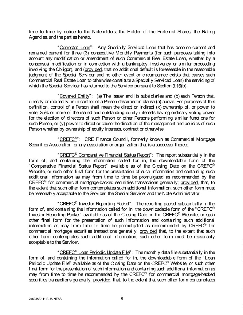 time to time by notice to the Noteholders, the Holder of the Preferred Shares, the Rating Agencies, and the parties hereto. “Corrected Loan”: Any Specially Serviced Loan that has become current and remained current for three (3) consecutive Monthly Payments (for such purposes taking into account any modification or amendment of such Commercial Real Estate Loan, whether by a consensual modification or in connection with a bankruptcy, insolvency or similar proceeding involving the Obligor), and (provided, that no additional default is foreseeable in the reasonable judgment of the Special Servicer and no other event or circumstance exists that causes such Commercial Real Estate Loan to otherwise constitute a Specially Serviced Loan) the servicing of which the Special Servicer has returned to the Servicer pursuant to Section 3.16(b). “Covered Entity”: (a) The Issuer and its subsidiaries and (b) each Person that, directly or indirectly, is in control of a Person described in clause (a) above. For purposes of this definition, control of a Person shall mean the direct or indirect (x) ownership of, or power to vote, 25% or more of the issued and outstanding equity interests having ordinary voting power for the election of directors of such Person or other Persons performing similar functions for such Person, or (y) power to direct or cause the direction of the management and policies of such Person whether by ownership of equity interests, contract or otherwise. “CREFC®”: CRE Finance Council, formerly known as Commercial Mortgage Securities Association, or any association or organization that is a successor thereto. “CREFC® Comparative Financial Status Report”: The report substantially in the form of, and containing the information called for in, the downloadable form of the “Comparative Financial Status Report” available as of the Closing Date on the CREFC® Website, or such other final form for the presentation of such information and containing such additional information as may from time to time be promulgated as recommended by the CREFC® for commercial mortgage-backed securities transactions generally; provided, that, to the extent that such other form contemplates such additional information, such other form must be reasonably acceptable to the Servicer, the Special Servicer and the Note Administrator. “CREFC® Investor Reporting Packet”: The reporting packet substantially in the form of, and containing the information called for in, the downloadable form of the “CREFC® Investor Reporting Packet” available as of the Closing Date on the CREFC® Website, or such other final form for the presentation of such information and containing such additional information as may from time to time be promulgated as recommended by CREFC® for commercial mortgage securities transactions generally; provided that, to the extent that such other form contemplates such additional information, such other form must be reasonably acceptable to the Servicer. “CREFC® Loan Periodic Update File”: The monthly data file substantially in the form of, and containing the information called for in, the downloadable form of the “Loan Periodic Update File” available as of the Closing Date on the CREFC® Website, or such other final form for the presentation of such information and containing such additional information as may from time to time be recommended by the CREFC® for commercial mortgage-backed securities transactions generally; provided, that, to the extent that such other form contemplates 24531587.11.BUSINESS -8-