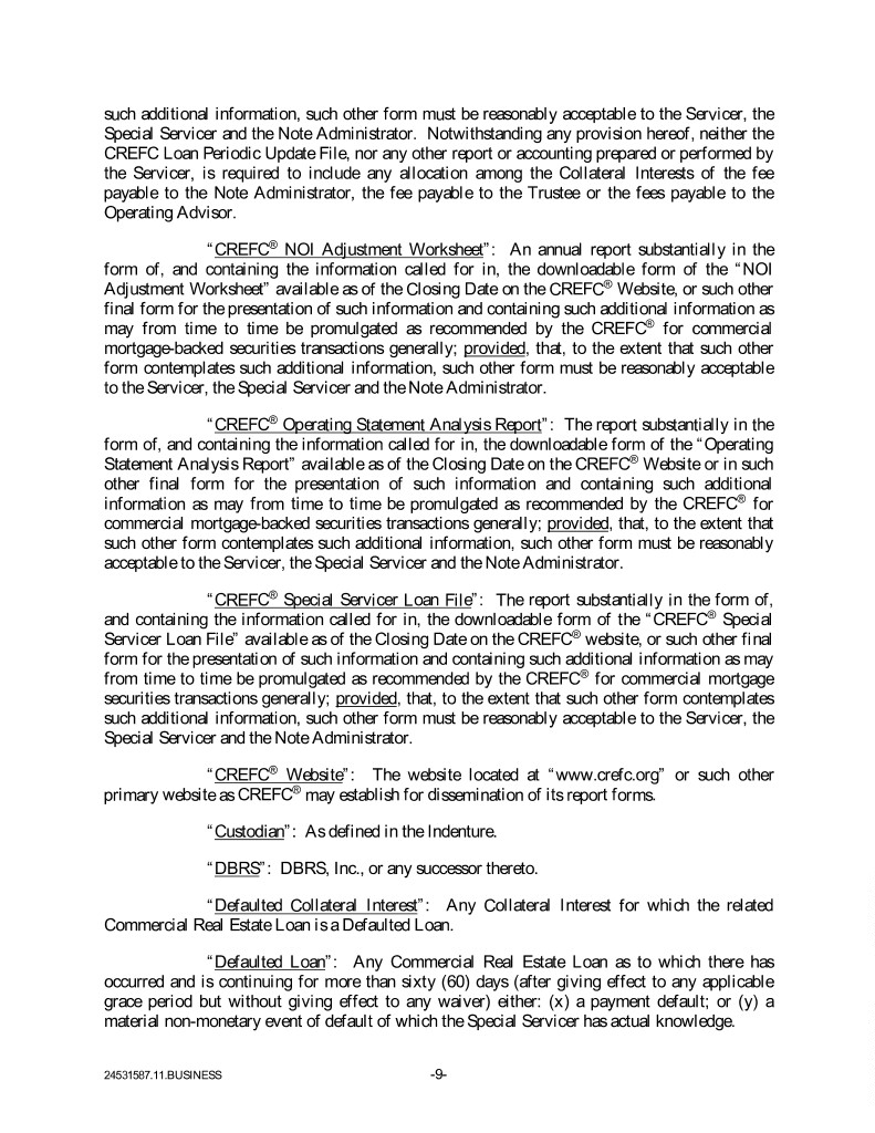 such additional information, such other form must be reasonably acceptable to the Servicer, the Special Servicer and the Note Administrator. Notwithstanding any provision hereof, neither the CREFC Loan Periodic Update File, nor any other report or accounting prepared or performed by the Servicer, is required to include any allocation among the Collateral Interests of the fee payable to the Note Administrator, the fee payable to the Trustee or the fees payable to the Operating Advisor. “CREFC® NOI Adjustment Worksheet”: An annual report substantially in the form of, and containing the information called for in, the downloadable form of the “NOI Adjustment Worksheet” available as of the Closing Date on the CREFC® Website, or such other final form for the presentation of such information and containing such additional information as may from time to time be promulgated as recommended by the CREFC® for commercial mortgage-backed securities transactions generally; provided, that, to the extent that such other form contemplates such additional information, such other form must be reasonably acceptable to the Servicer, the Special Servicer and the Note Administrator. “CREFC® Operating Statement Analysis Report”: The report substantially in the form of, and containing the information called for in, the downloadable form of the “Operating Statement Analysis Report” available as of the Closing Date on the CREFC® Website or in such other final form for the presentation of such information and containing such additional information as may from time to time be promulgated as recommended by the CREFC® for commercial mortgage-backed securities transactions generally; provided, that, to the extent that such other form contemplates such additional information, such other form must be reasonably acceptable to the Servicer, the Special Servicer and the Note Administrator. “CREFC® Special Servicer Loan File”: The report substantially in the form of, and containing the information called for in, the downloadable form of the “CREFC® Special Servicer Loan File” available as of the Closing Date on the CREFC® website, or such other final form for the presentation of such information and containing such additional information as may from time to time be promulgated as recommended by the CREFC® for commercial mortgage securities transactions generally; provided, that, to the extent that such other form contemplates such additional information, such other form must be reasonably acceptable to the Servicer, the Special Servicer and the Note Administrator. “CREFC® Website”: The website located at “www.crefc.org” or such other primary website as CREFC® may establish for dissemination of its report forms. “Custodian”: As defined in the Indenture. “DBRS”: DBRS, Inc., or any successor thereto. “Defaulted Collateral Interest”: Any Collateral Interest for which the related Commercial Real Estate Loan is a Defaulted Loan. “Defaulted Loan”: Any Commercial Real Estate Loan as to which there has occurred and is continuing for more than sixty (60) days (after giving effect to any applicable grace period but without giving effect to any waiver) either: (x) a payment default; or (y) a material non-monetary event of default of which the Special Servicer has actual knowledge. 24531587.11.BUSINESS -9-