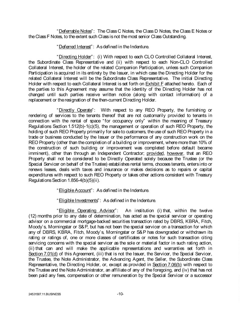 “Deferrable Notes”: The Class C Notes, the Class D Notes, the Class E Notes or the Class F Notes, to the extent such Class is not the most senior Class Outstanding. “Deferred Interest”: As defined in the Indenture. “Directing Holder”: (i) With respect to each CLO Controlled Collateral Interest, the Subordinate Class Representative and (ii) with respect to each Non-CLO Controlled Collateral Interest, the holder of the related Companion Participation, unless such Companion Participation is acquired in its entirety by the Issuer, in which case the Directing Holder for the related Collateral Interest will be the Subordinate Class Representative. The initial Directing Holder with respect to each Collateral Interest is set forth on Exhibit F attached hereto. Each of the parties to this Agreement may assume that the identity of the Directing Holder has not changed until such parties receive written notice (along with contact information) of a replacement or the resignation of the then-current Directing Holder. “Directly Operate”: With respect to any REO Property, the furnishing or rendering of services to the tenants thereof that are not customarily provided to tenants in connection with the rental of space “for occupancy only” within the meaning of Treasury Regulations Section 1.512(b)-1(c)(5), the management or operation of such REO Property, the holding of such REO Property primarily for sale to customers, the use of such REO Property in a trade or business conducted by the Issuer or the performance of any construction work on the REO Property (other than the completion of a building or improvement, where more than 10% of the construction of such building or improvement was completed before default became imminent), other than through an Independent Contractor; provided, however, that an REO Property shall not be considered to be Directly Operated solely because the Trustee (or the Special Servicer on behalf of the Trustee) establishes rental terms, chooses tenants, enters into or renews leases, deals with taxes and insurance or makes decisions as to repairs or capital expenditures with respect to such REO Property or takes other actions consistent with Treasury Regulations Section 1.856-4(b)(5)(ii). “Eligible Account”: As defined in the Indenture. “Eligible Investments”: As defined in the Indenture. “Eligible Operating Advisor”: An institution (i) that, within the twelve (12) months prior to any date of determination, has acted as the special servicer or operating advisor on a commercial mortgage-backed securities transaction rated by DBRS, KBRA, Fitch, Moody’s, Morningstar or S&P, but has not been the special servicer on a transaction for which any of DBRS, KBRA, Fitch, Moody’s, Morningstar or S&P has downgraded or withdrawn its rating or ratings of, one or more classes of certificates or notes for such transaction citing servicing concerns with the special servicer as the sole or material factor in such rating action, (ii) that can and will make the applicable representations and warranties set forth in Section 7.01(d) of this Agreement, (iii) that is not the Issuer, the Servicer, the Special Servicer, the Trustee, the Note Administrator, the Advancing Agent, the Seller, the Subordinate Class Representative, the Directing Holder, or, except as provided in Section 7.06(b) with respect to the Trustee and the Note Administrator, an affiliate of any of the foregoing, and (iv) that has not been paid any fees, compensation or other remuneration by the Special Servicer or a successor 24531587.11.BUSINESS -10-