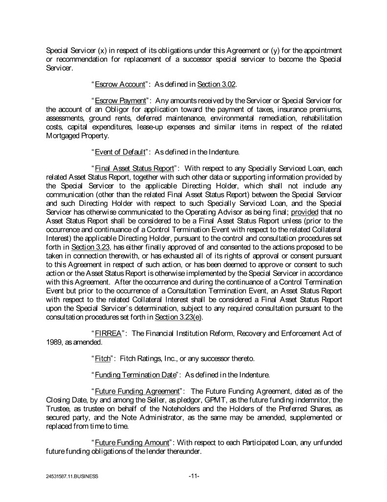 Special Servicer (x) in respect of its obligations under this Agreement or (y) for the appointment or recommendation for replacement of a successor special servicer to become the Special Servicer. “Escrow Account”: As defined in Section 3.02. “Escrow Payment”: Any amounts received by the Servicer or Special Servicer for the account of an Obligor for application toward the payment of taxes, insurance premiums, assessments, ground rents, deferred maintenance, environmental remediation, rehabilitation costs, capital expenditures, lease-up expenses and similar items in respect of the related Mortgaged Property. “Event of Default”: As defined in the Indenture. “Final Asset Status Report”: With respect to any Specially Serviced Loan, each related Asset Status Report, together with such other data or supporting information provided by the Special Servicer to the applicable Directing Holder, which shall not include any communication (other than the related Final Asset Status Report) between the Special Servicer and such Directing Holder with respect to such Specially Serviced Loan, and the Special Servicer has otherwise communicated to the Operating Advisor as being final; provided that no Asset Status Report shall be considered to be a Final Asset Status Report unless (prior to the occurrence and continuance of a Control Termination Event with respect to the related Collateral Interest) the applicable Directing Holder, pursuant to the control and consultation procedures set forth in Section 3.23, has either finally approved of and consented to the actions proposed to be taken in connection therewith, or has exhausted all of its rights of approval or consent pursuant to this Agreement in respect of such action, or has been deemed to approve or consent to such action or the Asset Status Report is otherwise implemented by the Special Servicer in accordance with this Agreement. After the occurrence and during the continuance of a Control Termination Event but prior to the occurrence of a Consultation Termination Event, an Asset Status Report with respect to the related Collateral Interest shall be considered a Final Asset Status Report upon the Special Servicer’s determination, subject to any required consultation pursuant to the consultation procedures set forth in Section 3.23(e). “FIRREA”: The Financial Institution Reform, Recovery and Enforcement Act of 1989, as amended. “Fitch”: Fitch Ratings, Inc., or any successor thereto. “Funding Termination Date”: As defined in the Indenture. “Future Funding Agreement”: The Future Funding Agreement, dated as of the Closing Date, by and among the Seller, as pledgor, GPMT, as the future funding indemnitor, the Trustee, as trustee on behalf of the Noteholders and the Holders of the Preferred Shares, as secured party, and the Note Administrator, as the same may be amended, supplemented or replaced from time to time. “Future Funding Amount”: With respect to each Participated Loan, any unfunded future funding obligations of the lender thereunder. 24531587.11.BUSINESS -11-