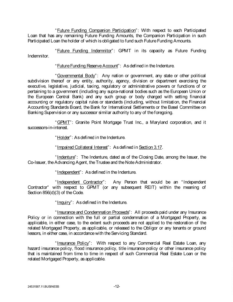 “Future Funding Companion Participation”: With respect to each Participated Loan that has any remaining Future Funding Amounts, the Companion Participation in such Participated Loan the holder of which is obligated to fund such Future Funding Amounts. “Future Funding Indemnitor”: GPMT in its capacity as Future Funding Indemnitor. “Future Funding Reserve Account”: As defined in the Indenture. “Governmental Body”: Any nation or government, any state or other political subdivision thereof or any entity, authority, agency, division or department exercising the executive, legislative, judicial, taxing, regulatory or administrative powers or functions of or pertaining to a government (including any supra-national bodies such as the European Union or the European Central Bank) and any such group or body charged with setting financial accounting or regulatory capital rules or standards (including, without limitation, the Financial Accounting Standards Board, the Bank for International Settlements or the Basel Committee on Banking Supervision or any successor similar authority to any of the foregoing. “GPMT”: Granite Point Mortgage Trust Inc., a Maryland corporation, and it successors-in-interest. “Holder”: As defined in the Indenture. “Impaired Collateral Interest”: As defined in Section 3.17. “Indenture”: The Indenture, dated as of the Closing Date, among the Issuer, the Co-Issuer, the Advancing Agent, the Trustee and the Note Administrator. “Independent”: As defined in the Indenture. “Independent Contractor”: Any Person that would be an “Independent Contractor” with respect to GPMT (or any subsequent REIT) within the meaning of Section 856(d)(3) of the Code. “Inquiry”: As defined in the Indenture. “Insurance and Condemnation Proceeds”: All proceeds paid under any Insurance Policy or in connection with the full or partial condemnation of a Mortgaged Property, as applicable, in either case, to the extent such proceeds are not applied to the restoration of the related Mortgaged Property, as applicable, or released to the Obligor or any tenants or ground lessors, in either case, in accordance with the Servicing Standard. “Insurance Policy”: With respect to any Commercial Real Estate Loan, any hazard insurance policy, flood insurance policy, title insurance policy or other insurance policy that is maintained from time to time in respect of such Commercial Real Estate Loan or the related Mortgaged Property, as applicable. 24531587.11.BUSINESS -12-