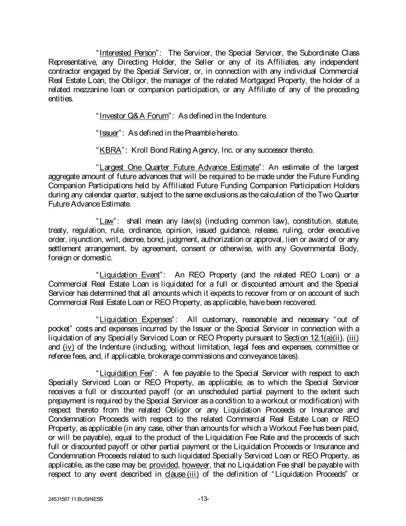 “Interested Person”: The Servicer, the Special Servicer, the Subordinate Class Representative, any Directing Holder, the Seller or any of its Affiliates, any independent contractor engaged by the Special Servicer, or, in connection with any individual Commercial Real Estate Loan, the Obligor, the manager of the related Mortgaged Property, the holder of a related mezzanine loan or companion participation, or any Affiliate of any of the preceding entities. “Investor Q&A Forum”: As defined in the Indenture. “Issuer”: As defined in the Preamble hereto. “KBRA”: Kroll Bond Rating Agency, Inc. or any successor thereto. “Largest One Quarter Future Advance Estimate”: An estimate of the largest aggregate amount of future advances that will be required to be made under the Future Funding Companion Participations held by Affiliated Future Funding Companion Participation Holders during any calendar quarter, subject to the same exclusions as the calculation of the Two Quarter Future Advance Estimate. “Law”: shall mean any law(s) (including common law), constitution, statute, treaty, regulation, rule, ordinance, opinion, issued guidance, release, ruling, order executive order, injunction, writ, decree, bond, judgment, authorization or approval, lien or award of or any settlement arrangement, by agreement, consent or otherwise, with any Governmental Body, foreign or domestic. “Liquidation Event”: An REO Property (and the related REO Loan) or a Commercial Real Estate Loan is liquidated for a full or discounted amount and the Special Servicer has determined that all amounts which it expects to recover from or on account of such Commercial Real Estate Loan or REO Property, as applicable, have been recovered. “Liquidation Expenses”: All customary, reasonable and necessary “out of pocket” costs and expenses incurred by the Issuer or the Special Servicer in connection with a liquidation of any Specially Serviced Loan or REO Property pursuant to Section 12.1(a)(ii), (iii) and (iv) of the Indenture (including, without limitation, legal fees and expenses, committee or referee fees, and, if applicable, brokerage commissions and conveyance taxes). “Liquidation Fee”: A fee payable to the Special Servicer with respect to each Specially Serviced Loan or REO Property, as applicable, as to which the Special Servicer receives a full or discounted payoff (or an unscheduled partial payment to the extent such prepayment is required by the Special Servicer as a condition to a workout or modification) with respect thereto from the related Obligor or any Liquidation Proceeds or Insurance and Condemnation Proceeds with respect to the related Commercial Real Estate Loan or REO Property, as applicable (in any case, other than amounts for which a Workout Fee has been paid, or will be payable), equal to the product of the Liquidation Fee Rate and the proceeds of such full or discounted payoff or other partial payment or the Liquidation Proceeds or Insurance and Condemnation Proceeds related to such liquidated Specially Serviced Loan or REO Property, as applicable, as the case may be; provided, however, that no Liquidation Fee shall be payable with respect to any event described in clause (iii) of the definition of “Liquidation Proceeds” or 24531587.11.BUSINESS -13-