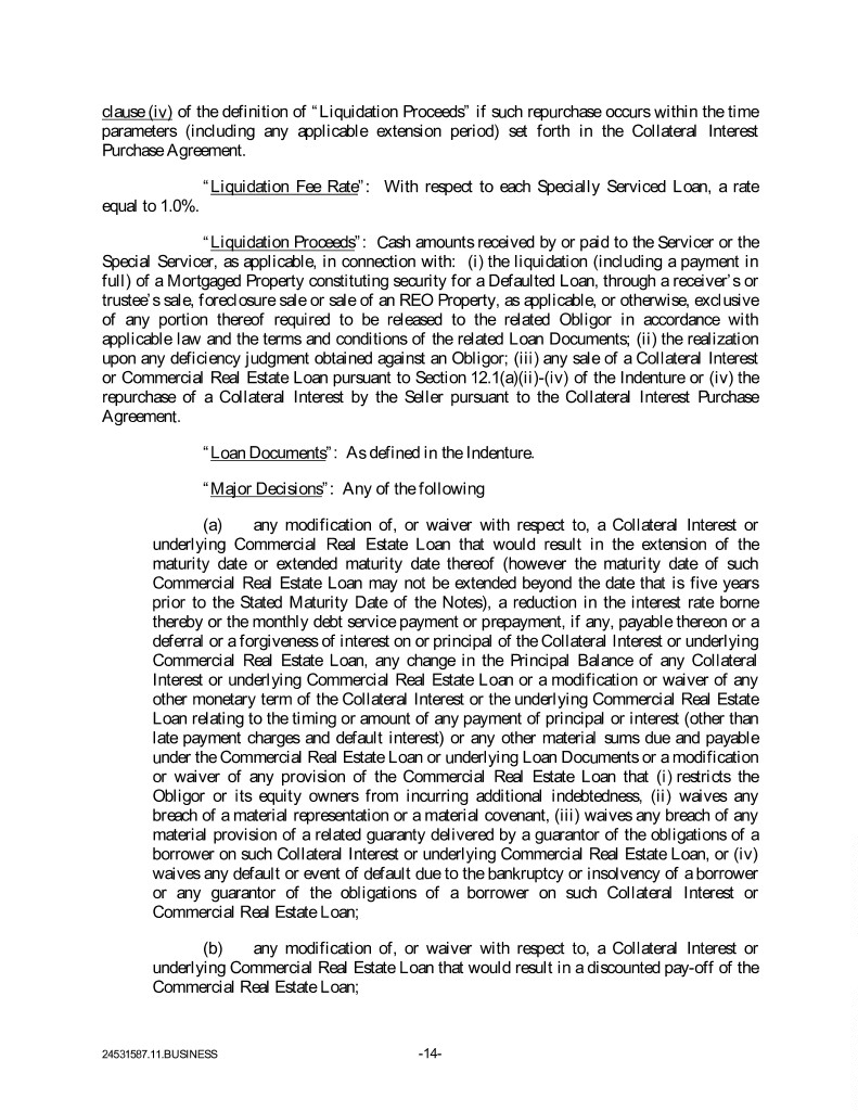 clause (iv) of the definition of “Liquidation Proceeds” if such repurchase occurs within the time parameters (including any applicable extension period) set forth in the Collateral Interest Purchase Agreement. “Liquidation Fee Rate”: With respect to each Specially Serviced Loan, a rate equal to 1.0%. “Liquidation Proceeds”: Cash amounts received by or paid to the Servicer or the Special Servicer, as applicable, in connection with: (i) the liquidation (including a payment in full) of a Mortgaged Property constituting security for a Defaulted Loan, through a receiver’s or trustee’s sale, foreclosure sale or sale of an REO Property, as applicable, or otherwise, exclusive of any portion thereof required to be released to the related Obligor in accordance with applicable law and the terms and conditions of the related Loan Documents; (ii) the realization upon any deficiency judgment obtained against an Obligor; (iii) any sale of a Collateral Interest or Commercial Real Estate Loan pursuant to Section 12.1(a)(ii)-(iv) of the Indenture or (iv) the repurchase of a Collateral Interest by the Seller pursuant to the Collateral Interest Purchase Agreement. “Loan Documents”: As defined in the Indenture. “Major Decisions”: Any of the following (a) any modification of, or waiver with respect to, a Collateral Interest or underlying Commercial Real Estate Loan that would result in the extension of the maturity date or extended maturity date thereof (however the maturity date of such Commercial Real Estate Loan may not be extended beyond the date that is five years prior to the Stated Maturity Date of the Notes), a reduction in the interest rate borne thereby or the monthly debt service payment or prepayment, if any, payable thereon or a deferral or a forgiveness of interest on or principal of the Collateral Interest or underlying Commercial Real Estate Loan, any change in the Principal Balance of any Collateral Interest or underlying Commercial Real Estate Loan or a modification or waiver of any other monetary term of the Collateral Interest or the underlying Commercial Real Estate Loan relating to the timing or amount of any payment of principal or interest (other than late payment charges and default interest) or any other material sums due and payable under the Commercial Real Estate Loan or underlying Loan Documents or a modification or waiver of any provision of the Commercial Real Estate Loan that (i) restricts the Obligor or its equity owners from incurring additional indebtedness, (ii) waives any breach of a material representation or a material covenant, (iii) waives any breach of any material provision of a related guaranty delivered by a guarantor of the obligations of a borrower on such Collateral Interest or underlying Commercial Real Estate Loan, or (iv) waives any default or event of default due to the bankruptcy or insolvency of a borrower or any guarantor of the obligations of a borrower on such Collateral Interest or Commercial Real Estate Loan; (b) any modification of, or waiver with respect to, a Collateral Interest or underlying Commercial Real Estate Loan that would result in a discounted pay-off of the Commercial Real Estate Loan; 24531587.11.BUSINESS -14-