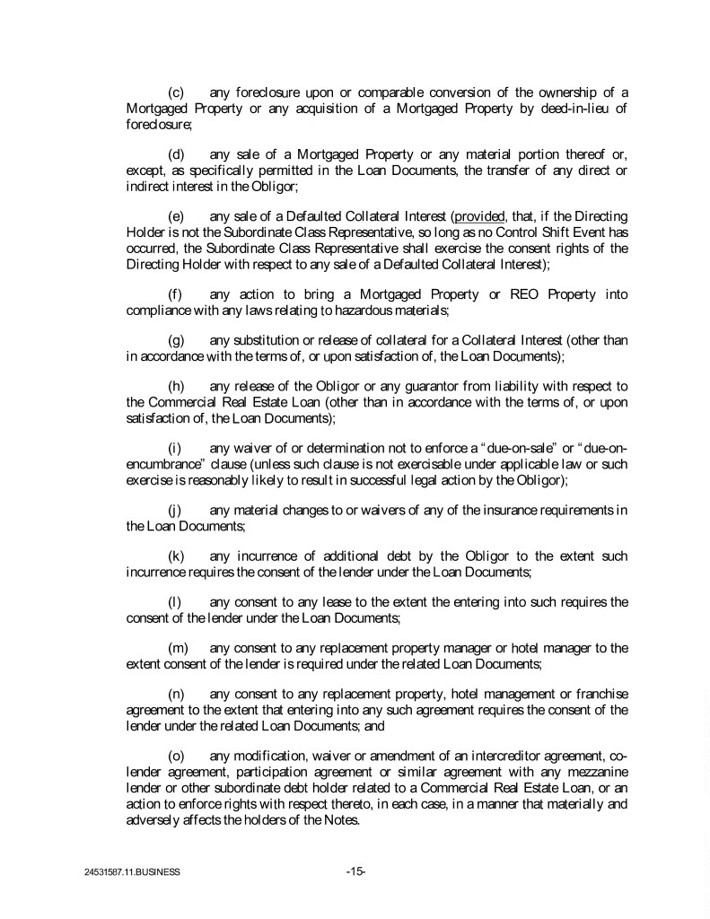 (c) any foreclosure upon or comparable conversion of the ownership of a Mortgaged Property or any acquisition of a Mortgaged Property by deed-in-lieu of foreclosure; (d) any sale of a Mortgaged Property or any material portion thereof or, except, as specifically permitted in the Loan Documents, the transfer of any direct or indirect interest in the Obligor; (e) any sale of a Defaulted Collateral Interest (provided, that, if the Directing Holder is not the Subordinate Class Representative, so long as no Control Shift Event has occurred, the Subordinate Class Representative shall exercise the consent rights of the Directing Holder with respect to any sale of a Defaulted Collateral Interest); (f) any action to bring a Mortgaged Property or REO Property into compliance with any laws relating to hazardous materials; (g) any substitution or release of collateral for a Collateral Interest (other than in accordance with the terms of, or upon satisfaction of, the Loan Documents); (h) any release of the Obligor or any guarantor from liability with respect to the Commercial Real Estate Loan (other than in accordance with the terms of, or upon satisfaction of, the Loan Documents); (i) any waiver of or determination not to enforce a “due-on-sale” or “due-on- encumbrance” clause (unless such clause is not exercisable under applicable law or such exercise is reasonably likely to result in successful legal action by the Obligor); (j) any material changes to or waivers of any of the insurance requirements in the Loan Documents; (k) any incurrence of additional debt by the Obligor to the extent such incurrence requires the consent of the lender under the Loan Documents; (l) any consent to any lease to the extent the entering into such requires the consent of the lender under the Loan Documents; (m) any consent to any replacement property manager or hotel manager to the extent consent of the lender is required under the related Loan Documents; (n) any consent to any replacement property, hotel management or franchise agreement to the extent that entering into any such agreement requires the consent of the lender under the related Loan Documents; and (o) any modification, waiver or amendment of an intercreditor agreement, co- lender agreement, participation agreement or similar agreement with any mezzanine lender or other subordinate debt holder related to a Commercial Real Estate Loan, or an action to enforce rights with respect thereto, in each case, in a manner that materially and adversely affects the holders of the Notes. 24531587.11.BUSINESS -15-