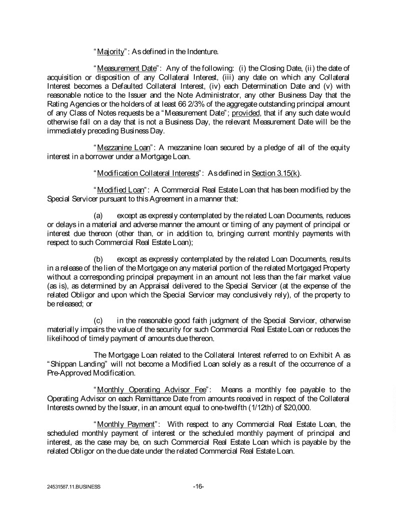 “Majority”: As defined in the Indenture. “Measurement Date”: Any of the following: (i) the Closing Date, (ii) the date of acquisition or disposition of any Collateral Interest, (iii) any date on which any Collateral Interest becomes a Defaulted Collateral Interest, (iv) each Determination Date and (v) with reasonable notice to the Issuer and the Note Administrator, any other Business Day that the Rating Agencies or the holders of at least 66 2/3% of the aggregate outstanding principal amount of any Class of Notes requests be a “Measurement Date”; provided, that if any such date would otherwise fall on a day that is not a Business Day, the relevant Measurement Date will be the immediately preceding Business Day. “Mezzanine Loan”: A mezzanine loan secured by a pledge of all of the equity interest in a borrower under a Mortgage Loan. “Modification Collateral Interests”: As defined in Section 3.15(k). “Modified Loan”: A Commercial Real Estate Loan that has been modified by the Special Servicer pursuant to this Agreement in a manner that: (a) except as expressly contemplated by the related Loan Documents, reduces or delays in a material and adverse manner the amount or timing of any payment of principal or interest due thereon (other than, or in addition to, bringing current monthly payments with respect to such Commercial Real Estate Loan); (b) except as expressly contemplated by the related Loan Documents, results in a release of the lien of the Mortgage on any material portion of the related Mortgaged Property without a corresponding principal prepayment in an amount not less than the fair market value (as is), as determined by an Appraisal delivered to the Special Servicer (at the expense of the related Obligor and upon which the Special Servicer may conclusively rely), of the property to be released; or (c) in the reasonable good faith judgment of the Special Servicer, otherwise materially impairs the value of the security for such Commercial Real Estate Loan or reduces the likelihood of timely payment of amounts due thereon. The Mortgage Loan related to the Collateral Interest referred to on Exhibit A as “Shippan Landing” will not become a Modified Loan solely as a result of the occurrence of a Pre-Approved Modification. “Monthly Operating Advisor Fee”: Means a monthly fee payable to the Operating Advisor on each Remittance Date from amounts received in respect of the Collateral Interests owned by the Issuer, in an amount equal to one-twelfth (1/12th) of $20,000. “Monthly Payment”: With respect to any Commercial Real Estate Loan, the scheduled monthly payment of interest or the scheduled monthly payment of principal and interest, as the case may be, on such Commercial Real Estate Loan which is payable by the related Obligor on the due date under the related Commercial Real Estate Loan. 24531587.11.BUSINESS -16-