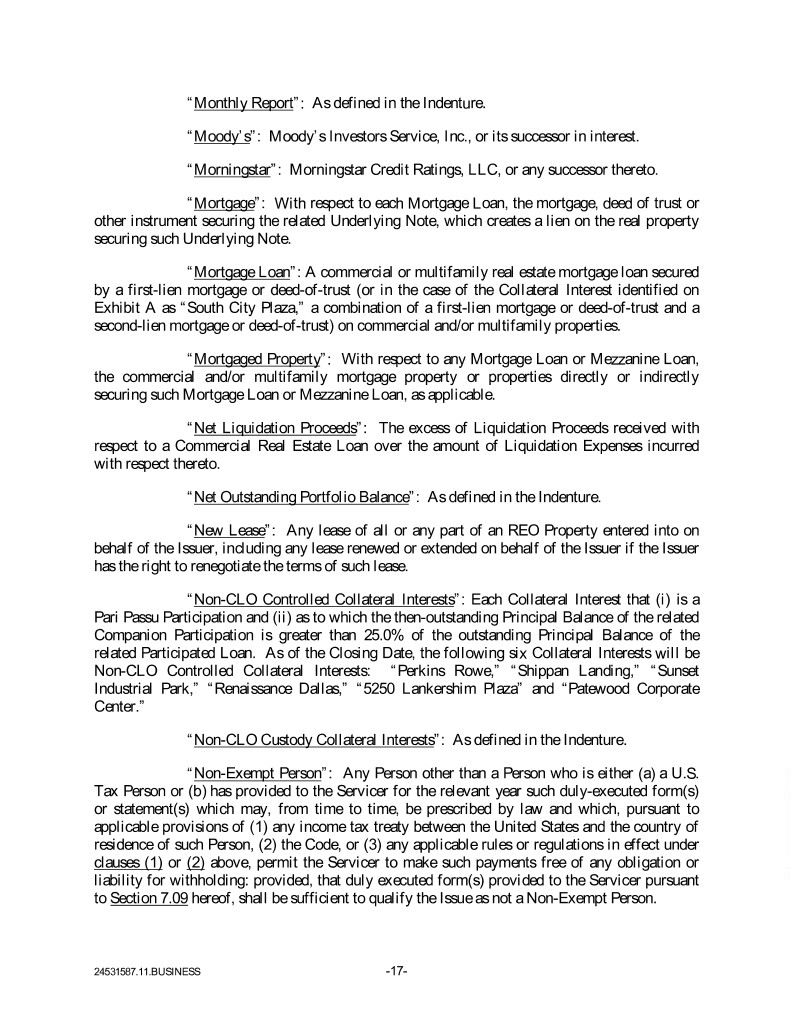 “Monthly Report”: As defined in the Indenture. “Moody’s”: Moody’s Investors Service, Inc., or its successor in interest. “Morningstar”: Morningstar Credit Ratings, LLC, or any successor thereto. “Mortgage”: With respect to each Mortgage Loan, the mortgage, deed of trust or other instrument securing the related Underlying Note, which creates a lien on the real property securing such Underlying Note. “Mortgage Loan”: A commercial or multifamily real estate mortgage loan secured by a first-lien mortgage or deed-of-trust (or in the case of the Collateral Interest identified on Exhibit A as “South City Plaza,” a combination of a first-lien mortgage or deed-of-trust and a second-lien mortgage or deed-of-trust) on commercial and/or multifamily properties. “Mortgaged Property”: With respect to any Mortgage Loan or Mezzanine Loan, the commercial and/or multifamily mortgage property or properties directly or indirectly securing such Mortgage Loan or Mezzanine Loan, as applicable. “Net Liquidation Proceeds”: The excess of Liquidation Proceeds received with respect to a Commercial Real Estate Loan over the amount of Liquidation Expenses incurred with respect thereto. “Net Outstanding Portfolio Balance”: As defined in the Indenture. “New Lease”: Any lease of all or any part of an REO Property entered into on behalf of the Issuer, including any lease renewed or extended on behalf of the Issuer if the Issuer has the right to renegotiate the terms of such lease. “Non-CLO Controlled Collateral Interests”: Each Collateral Interest that (i) is a Pari Passu Participation and (ii) as to which the then-outstanding Principal Balance of the related Companion Participation is greater than 25.0% of the outstanding Principal Balance of the related Participated Loan. As of the Closing Date, the following six Collateral Interests will be Non-CLO Controlled Collateral Interests: “Perkins Rowe,” “Shippan Landing,” “Sunset Industrial Park,” “Renaissance Dallas,” “5250 Lankershim Plaza” and “Patewood Corporate Center.” “Non-CLO Custody Collateral Interests”: As defined in the Indenture. “Non-Exempt Person”: Any Person other than a Person who is either (a) a U.S. Tax Person or (b) has provided to the Servicer for the relevant year such duly-executed form(s) or statement(s) which may, from time to time, be prescribed by law and which, pursuant to applicable provisions of (1) any income tax treaty between the United States and the country of residence of such Person, (2) the Code, or (3) any applicable rules or regulations in effect under clauses (1) or (2) above, permit the Servicer to make such payments free of any obligation or liability for withholding: provided, that duly executed form(s) provided to the Servicer pursuant to Section 7.09 hereof, shall be sufficient to qualify the Issue as not a Non-Exempt Person. 24531587.11.BUSINESS -17-