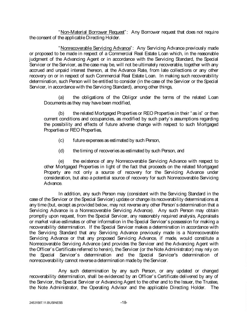 “Non-Material Borrower Request”: Any Borrower request that does not require the consent of the applicable Directing Holder. “Nonrecoverable Servicing Advance”: Any Servicing Advance previously made or proposed to be made in respect of a Commercial Real Estate Loan which, in the reasonable judgment of the Advancing Agent or in accordance with the Servicing Standard, the Special Servicer or the Servicer, as the case may be, will not be ultimately recoverable, together with any accrued and unpaid interest thereon, at the Advance Rate, from late collections or any other recovery on or in respect of such Commercial Real Estate Loan. In making such recoverability determination, such Person will be entitled to consider (in the case of the Servicer or the Special Servicer, in accordance with the Servicing Standard), among other things, (a) the obligations of the Obligor under the terms of the related Loan Documents as they may have been modified, (b) the related Mortgaged Properties or REO Properties in their “as is” or then current conditions and occupancies, as modified by such party’s assumptions regarding the possibility and effects of future adverse change with respect to such Mortgaged Properties or REO Properties, (c) future expenses as estimated by such Person, (d) the timing of recoveries as estimated by such Person, and (e) the existence of any Nonrecoverable Servicing Advance with respect to other Mortgaged Properties in light of the fact that proceeds on the related Mortgaged Property are not only a source of recovery for the Servicing Advance under consideration, but also a potential source of recovery for such Nonrecoverable Servicing Advance. In addition, any such Person may (consistent with the Servicing Standard in the case of the Servicer or the Special Servicer) update or change its recoverability determinations at any time (but, except as provided below, may not reverse any other Person’s determination that a Servicing Advance is a Nonrecoverable Servicing Advance). Any such Person may obtain promptly upon request, from the Special Servicer, any reasonably required analysis, Appraisals or market value estimates or other information in the Special Servicer’s possession for making a recoverability determination. If the Special Servicer makes a determination in accordance with the Servicing Standard that any Servicing Advance previously made is a Nonrecoverable Servicing Advance or that any proposed Servicing Advance, if made, would constitute a Nonrecoverable Servicing Advance (and provides the Servicer and the Advancing Agent with the Officer’s Certificate referred to herein), the Servicer (or the Note Administrator) may rely on the Special Servicer’s determination and the Special Servicer's determination of nonrecoverability cannot reverse a determination made by the Servicer. Any such determination by any such Person, or any updated or changed recoverability determination, shall be evidenced by an Officer’s Certificate delivered by any of the Servicer, the Special Servicer or Advancing Agent to the other and to the Issuer, the Trustee, the Note Administrator, the Operating Advisor and the applicable Directing Holder. The 24531587.11.BUSINESS -18-