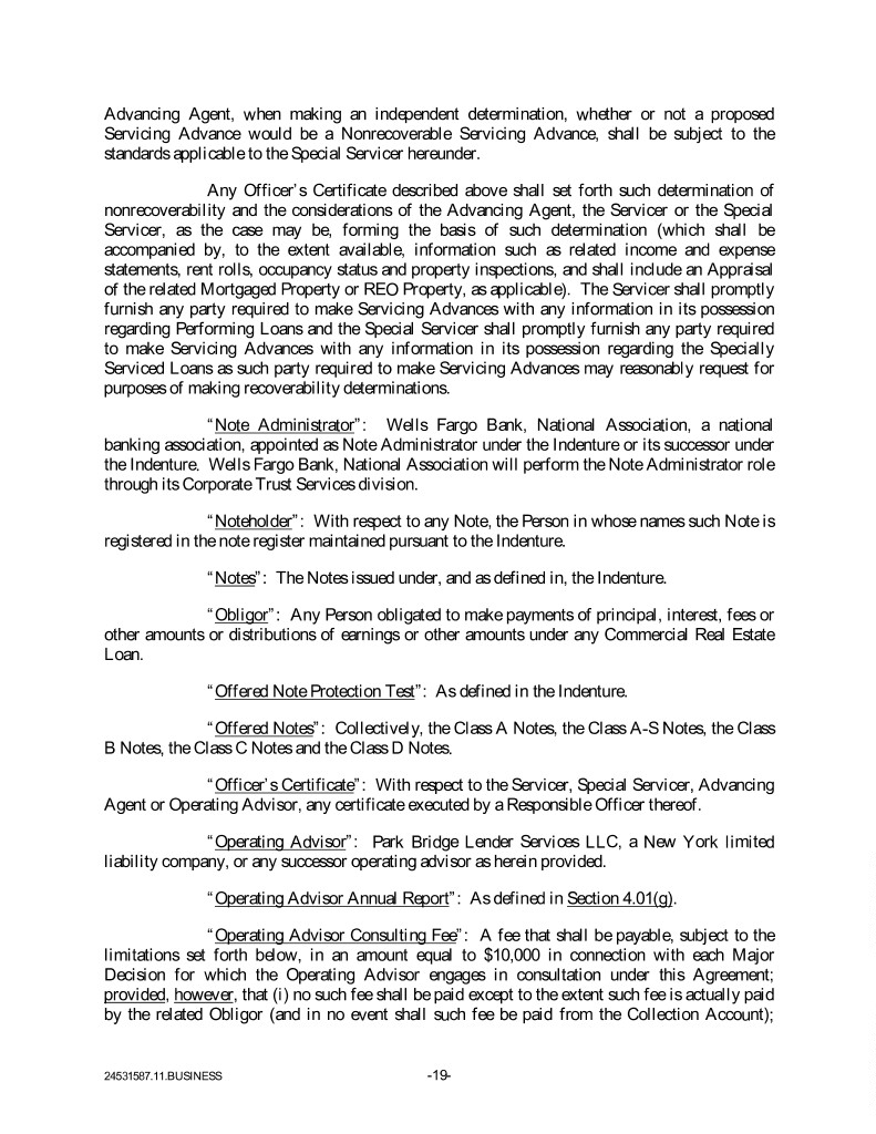 Advancing Agent, when making an independent determination, whether or not a proposed Servicing Advance would be a Nonrecoverable Servicing Advance, shall be subject to the standards applicable to the Special Servicer hereunder. Any Officer’s Certificate described above shall set forth such determination of nonrecoverability and the considerations of the Advancing Agent, the Servicer or the Special Servicer, as the case may be, forming the basis of such determination (which shall be accompanied by, to the extent available, information such as related income and expense statements, rent rolls, occupancy status and property inspections, and shall include an Appraisal of the related Mortgaged Property or REO Property, as applicable). The Servicer shall promptly furnish any party required to make Servicing Advances with any information in its possession regarding Performing Loans and the Special Servicer shall promptly furnish any party required to make Servicing Advances with any information in its possession regarding the Specially Serviced Loans as such party required to make Servicing Advances may reasonably request for purposes of making recoverability determinations. “Note Administrator”: Wells Fargo Bank, National Association, a national banking association, appointed as Note Administrator under the Indenture or its successor under the Indenture. Wells Fargo Bank, National Association will perform the Note Administrator role through its Corporate Trust Services division. “Noteholder”: With respect to any Note, the Person in whose names such Note is registered in the note register maintained pursuant to the Indenture. “Notes”: The Notes issued under, and as defined in, the Indenture. “Obligor”: Any Person obligated to make payments of principal, interest, fees or other amounts or distributions of earnings or other amounts under any Commercial Real Estate Loan. “Offered Note Protection Test”: As defined in the Indenture. “Offered Notes”: Collectively, the Class A Notes, the Class A-S Notes, the Class B Notes, the Class C Notes and the Class D Notes. “Officer’s Certificate”: With respect to the Servicer, Special Servicer, Advancing Agent or Operating Advisor, any certificate executed by a Responsible Officer thereof. “Operating Advisor”: Park Bridge Lender Services LLC, a New York limited liability company, or any successor operating advisor as herein provided. “Operating Advisor Annual Report”: As defined in Section 4.01(g). “Operating Advisor Consulting Fee”: A fee that shall be payable, subject to the limitations set forth below, in an amount equal to $10,000 in connection with each Major Decision for which the Operating Advisor engages in consultation under this Agreement; provided, however, that (i) no such fee shall be paid except to the extent such fee is actually paid by the related Obligor (and in no event shall such fee be paid from the Collection Account); 24531587.11.BUSINESS -19-