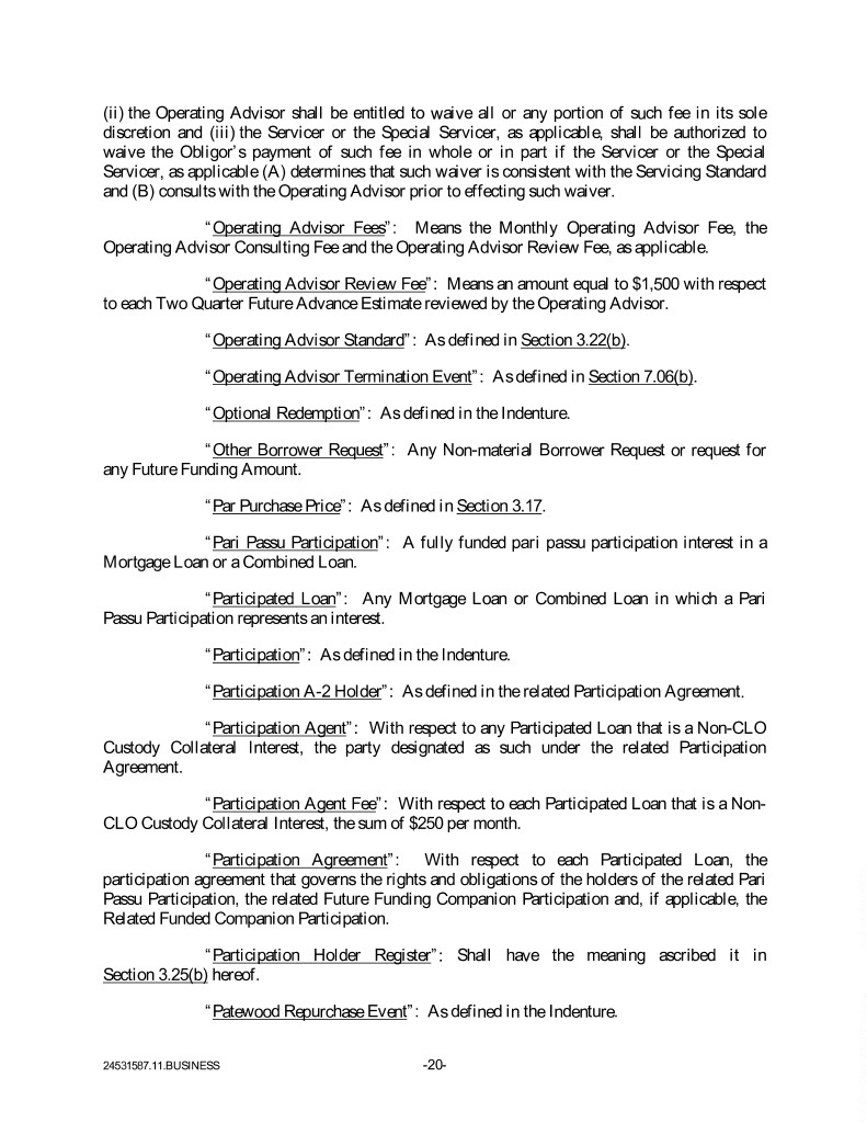 (ii) the Operating Advisor shall be entitled to waive all or any portion of such fee in its sole discretion and (iii) the Servicer or the Special Servicer, as applicable, shall be authorized to waive the Obligor’s payment of such fee in whole or in part if the Servicer or the Special Servicer, as applicable (A) determines that such waiver is consistent with the Servicing Standard and (B) consults with the Operating Advisor prior to effecting such waiver. “Operating Advisor Fees”: Means the Monthly Operating Advisor Fee, the Operating Advisor Consulting Fee and the Operating Advisor Review Fee, as applicable. “Operating Advisor Review Fee”: Means an amount equal to $1,500 with respect to each Two Quarter Future Advance Estimate reviewed by the Operating Advisor. “Operating Advisor Standard”: As defined in Section 3.22(b). “Operating Advisor Termination Event”: As defined in Section 7.06(b). “Optional Redemption”: As defined in the Indenture. “Other Borrower Request”: Any Non-material Borrower Request or request for any Future Funding Amount. “Par Purchase Price”: As defined in Section 3.17. “Pari Passu Participation”: A fully funded pari passu participation interest in a Mortgage Loan or a Combined Loan. “Participated Loan”: Any Mortgage Loan or Combined Loan in which a Pari Passu Participation represents an interest. “Participation”: As defined in the Indenture. “Participation A-2 Holder”: As defined in the related Participation Agreement. “Participation Agent”: With respect to any Participated Loan that is a Non-CLO Custody Collateral Interest, the party designated as such under the related Participation Agreement. “Participation Agent Fee”: With respect to each Participated Loan that is a Non- CLO Custody Collateral Interest, the sum of $250 per month. “Participation Agreement”: With respect to each Participated Loan, the participation agreement that governs the rights and obligations of the holders of the related Pari Passu Participation, the related Future Funding Companion Participation and, if applicable, the Related Funded Companion Participation. “Participation Holder Register”: Shall have the meaning ascribed it in Section 3.25(b) hereof. “Patewood Repurchase Event”: As defined in the Indenture. 24531587.11.BUSINESS -20-