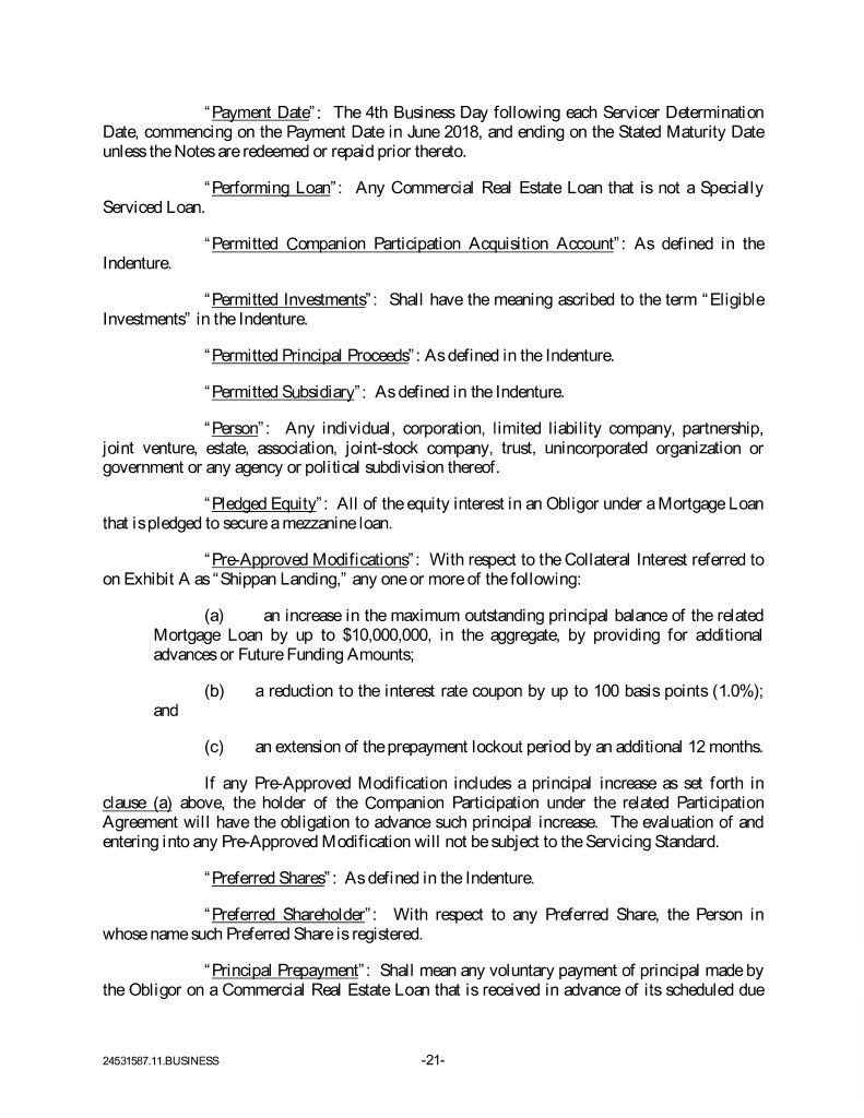 “Payment Date”: The 4th Business Day following each Servicer Determination Date, commencing on the Payment Date in June 2018, and ending on the Stated Maturity Date unless the Notes are redeemed or repaid prior thereto. “Performing Loan”: Any Commercial Real Estate Loan that is not a Specially Serviced Loan. “Permitted Companion Participation Acquisition Account”: As defined in the Indenture. “Permitted Investments”: Shall have the meaning ascribed to the term “Eligible Investments” in the Indenture. “Permitted Principal Proceeds”: As defined in the Indenture. “Permitted Subsidiary”: As defined in the Indenture. “Person”: Any individual, corporation, limited liability company, partnership, joint venture, estate, association, joint-stock company, trust, unincorporated organization or government or any agency or political subdivision thereof. “Pledged Equity”: All of the equity interest in an Obligor under a Mortgage Loan that is pledged to secure a mezzanine loan. “Pre-Approved Modifications”: With respect to the Collateral Interest referred to on Exhibit A as “Shippan Landing,” any one or more of the following: (a) an increase in the maximum outstanding principal balance of the related Mortgage Loan by up to $10,000,000, in the aggregate, by providing for additional advances or Future Funding Amounts; (b) a reduction to the interest rate coupon by up to 100 basis points (1.0%); and (c) an extension of the prepayment lockout period by an additional 12 months. If any Pre-Approved Modification includes a principal increase as set forth in clause (a) above, the holder of the Companion Participation under the related Participation Agreement will have the obligation to advance such principal increase. The evaluation of and entering into any Pre-Approved Modification will not be subject to the Servicing Standard. “Preferred Shares”: As defined in the Indenture. “Preferred Shareholder”: With respect to any Preferred Share, the Person in whose name such Preferred Share is registered. “Principal Prepayment”: Shall mean any voluntary payment of principal made by the Obligor on a Commercial Real Estate Loan that is received in advance of its scheduled due 24531587.11.BUSINESS -21-