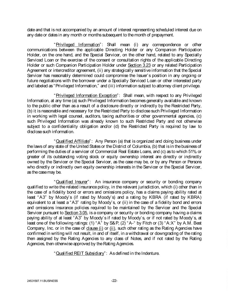 date and that is not accompanied by an amount of interest representing scheduled interest due on any date or dates in any month or months subsequent to the month of prepayment. “Privileged Information”: Shall mean (i) any correspondence or other communications between the applicable Directing Holder or any Companion Participation Holder, on the one hand, and the Special Servicer, on the other hand, related to any Specially Serviced Loan or the exercise of the consent or consultation rights of the applicable Directing Holder or such Companion Participation Holder under Section 3.23 or any related Participation Agreement or intercreditor agreement, (ii) any strategically sensitive information that the Special Servicer has reasonably determined could compromise the Issuer’s position in any ongoing or future negotiations with the borrower under a Specially Serviced Loan or other interested party and labeled as “Privileged Information,” and (iii) information subject to attorney client privilege. “Privileged Information Exception”: Shall mean, with respect to any Privileged Information, at any time (a) such Privileged Information becomes generally available and known to the public other than as a result of a disclosure directly or indirectly by the Restricted Party, (b) it is reasonable and necessary for the Restricted Party to disclose such Privileged Information in working with legal counsel, auditors, taxing authorities or other governmental agencies, (c) such Privileged Information was already known to such Restricted Party and not otherwise subject to a confidentiality obligation and/or (d) the Restricted Party is required by law to disclose such information. “Qualified Affiliate”: Any Person (a) that is organized and doing business under the laws of any state of the United States or the District of Columbia, (b) that is in the business of performing the duties of a servicer of Commercial Real Estate Loans, and (c) as to which 51% or greater of its outstanding voting stock or equity ownership interest are directly or indirectly owned by the Servicer or the Special Servicer, as the case may be, or by any Person or Persons who directly or indirectly own equity ownership interests in the Servicer or the Special Servicer, as the case may be. “Qualified Insurer”: An insurance company or security or bonding company qualified to write the related insurance policy, in the relevant jurisdiction, which (i) other than in the case of a fidelity bond or errors and omissions policy, has a claims paying ability rated at least “A3” by Moody’s (if rated by Moody’s) and a rating by KBRA (if rated by KBRA) equivalent to at least a “A3” rating by Moody’s, or (ii) in the case of a fidelity bond and errors and omissions insurance policies required to be maintained by the Servicer and the Special Servicer pursuant to Section 3.05, is a company or security or bonding company having a claims paying ability of at least “A3” by Moody’s if rated by Moody’s, or if not rated by Moody’s, at least one of the following ratings: (1) “A” by S&P, (2) “A-“ by Fitch or (3) “A:X” by A.M. Best Company, Inc. or in the case of clause (i) or (ii), such other rating as the Rating Agencies have confirmed in writing will not result, in and of itself, in a withdrawal or downgrading of the rating then assigned by the Rating Agencies to any class of Notes, and if not rated by the Rating Agencies, then otherwise approved by the Rating Agencies. “Qualified REIT Subsidiary”: As defined in the Indenture. 24531587.11.BUSINESS -22-