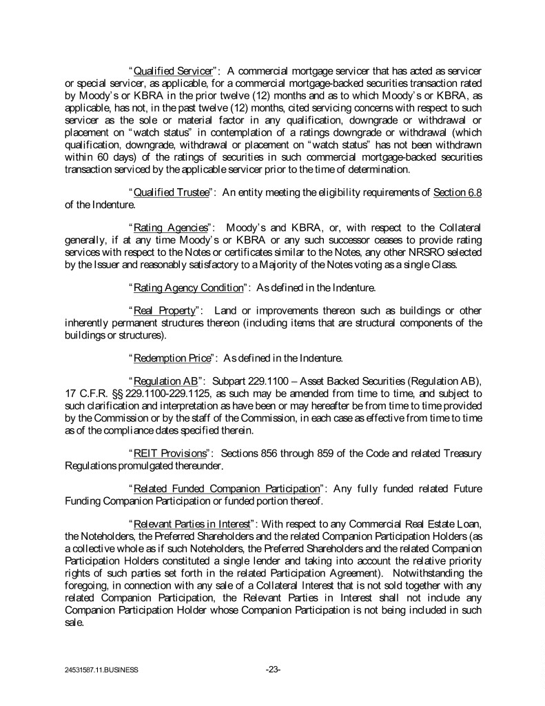 “Qualified Servicer”: A commercial mortgage servicer that has acted as servicer or special servicer, as applicable, for a commercial mortgage-backed securities transaction rated by Moody’s or KBRA in the prior twelve (12) months and as to which Moody’s or KBRA, as applicable, has not, in the past twelve (12) months, cited servicing concerns with respect to such servicer as the sole or material factor in any qualification, downgrade or withdrawal or placement on “watch status” in contemplation of a ratings downgrade or withdrawal (which qualification, downgrade, withdrawal or placement on “watch status” has not been withdrawn within 60 days) of the ratings of securities in such commercial mortgage-backed securities transaction serviced by the applicable servicer prior to the time of determination. “Qualified Trustee”: An entity meeting the eligibility requirements of Section 6.8 of the Indenture. “Rating Agencies”: Moody’s and KBRA, or, with respect to the Collateral generally, if at any time Moody’s or KBRA or any such successor ceases to provide rating services with respect to the Notes or certificates similar to the Notes, any other NRSRO selected by the Issuer and reasonably satisfactory to a Majority of the Notes voting as a single Class. “Rating Agency Condition”: As defined in the Indenture. “Real Property”: Land or improvements thereon such as buildings or other inherently permanent structures thereon (including items that are structural components of the buildings or structures). “Redemption Price”: As defined in the Indenture. “Regulation AB”: Subpart 229.1100 – Asset Backed Securities (Regulation AB), 17 C.F.R. §§ 229.1100-229.1125, as such may be amended from time to time, and subject to such clarification and interpretation as have been or may hereafter be from time to time provided by the Commission or by the staff of the Commission, in each case as effective from time to time as of the compliance dates specified therein. “REIT Provisions”: Sections 856 through 859 of the Code and related Treasury Regulations promulgated thereunder. “Related Funded Companion Participation”: Any fully funded related Future Funding Companion Participation or funded portion thereof. “Relevant Parties in Interest”: With respect to any Commercial Real Estate Loan, the Noteholders, the Preferred Shareholders and the related Companion Participation Holders (as a collective whole as if such Noteholders, the Preferred Shareholders and the related Companion Participation Holders constituted a single lender and taking into account the relative priority rights of such parties set forth in the related Participation Agreement). Notwithstanding the foregoing, in connection with any sale of a Collateral Interest that is not sold together with any related Companion Participation, the Relevant Parties in Interest shall not include any Companion Participation Holder whose Companion Participation is not being included in such sale. 24531587.11.BUSINESS -23-