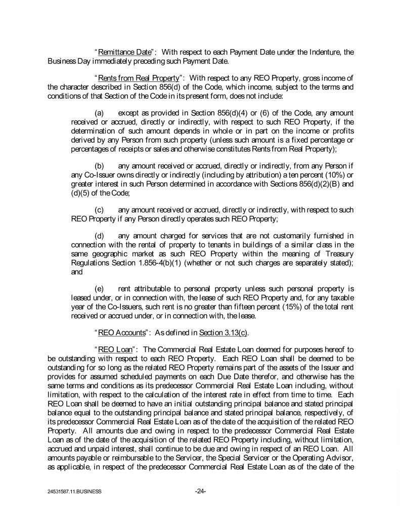 “Remittance Date”: With respect to each Payment Date under the Indenture, the Business Day immediately preceding such Payment Date. “Rents from Real Property”: With respect to any REO Property, gross income of the character described in Section 856(d) of the Code, which income, subject to the terms and conditions of that Section of the Code in its present form, does not include: (a) except as provided in Section 856(d)(4) or (6) of the Code, any amount received or accrued, directly or indirectly, with respect to such REO Property, if the determination of such amount depends in whole or in part on the income or profits derived by any Person from such property (unless such amount is a fixed percentage or percentages of receipts or sales and otherwise constitutes Rents from Real Property); (b) any amount received or accrued, directly or indirectly, from any Person if any Co-Issuer owns directly or indirectly (including by attribution) a ten percent (10%) or greater interest in such Person determined in accordance with Sections 856(d)(2)(B) and (d)(5) of the Code; (c) any amount received or accrued, directly or indirectly, with respect to such REO Property if any Person directly operates such REO Property; (d) any amount charged for services that are not customarily furnished in connection with the rental of property to tenants in buildings of a similar class in the same geographic market as such REO Property within the meaning of Treasury Regulations Section 1.856-4(b)(1) (whether or not such charges are separately stated); and (e) rent attributable to personal property unless such personal property is leased under, or in connection with, the lease of such REO Property and, for any taxable year of the Co-Issuers, such rent is no greater than fifteen percent (15%) of the total rent received or accrued under, or in connection with, the lease. “REO Accounts”: As defined in Section 3.13(c). “REO Loan”: The Commercial Real Estate Loan deemed for purposes hereof to be outstanding with respect to each REO Property. Each REO Loan shall be deemed to be outstanding for so long as the related REO Property remains part of the assets of the Issuer and provides for assumed scheduled payments on each Due Date therefor, and otherwise has the same terms and conditions as its predecessor Commercial Real Estate Loan including, without limitation, with respect to the calculation of the interest rate in effect from time to time. Each REO Loan shall be deemed to have an initial outstanding principal balance and stated principal balance equal to the outstanding principal balance and stated principal balance, respectively, of its predecessor Commercial Real Estate Loan as of the date of the acquisition of the related REO Property. All amounts due and owing in respect to the predecessor Commercial Real Estate Loan as of the date of the acquisition of the related REO Property including, without limitation, accrued and unpaid interest, shall continue to be due and owing in respect of an REO Loan. All amounts payable or reimbursable to the Servicer, the Special Servicer or the Operating Advisor, as applicable, in respect of the predecessor Commercial Real Estate Loan as of the date of the 24531587.11.BUSINESS -24-