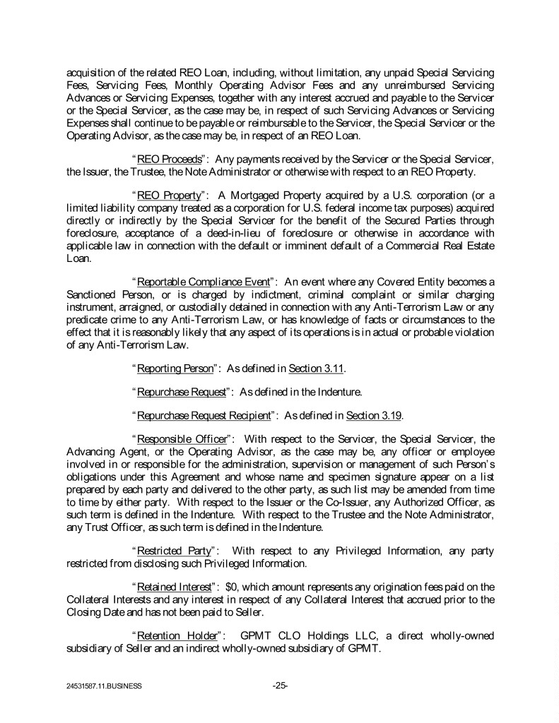 acquisition of the related REO Loan, including, without limitation, any unpaid Special Servicing Fees, Servicing Fees, Monthly Operating Advisor Fees and any unreimbursed Servicing Advances or Servicing Expenses, together with any interest accrued and payable to the Servicer or the Special Servicer, as the case may be, in respect of such Servicing Advances or Servicing Expenses shall continue to be payable or reimbursable to the Servicer, the Special Servicer or the Operating Advisor, as the case may be, in respect of an REO Loan. “REO Proceeds”: Any payments received by the Servicer or the Special Servicer, the Issuer, the Trustee, the Note Administrator or otherwise with respect to an REO Property. “REO Property”: A Mortgaged Property acquired by a U.S. corporation (or a limited liability company treated as a corporation for U.S. federal income tax purposes) acquired directly or indirectly by the Special Servicer for the benefit of the Secured Parties through foreclosure, acceptance of a deed-in-lieu of foreclosure or otherwise in accordance with applicable law in connection with the default or imminent default of a Commercial Real Estate Loan. “Reportable Compliance Event”: An event where any Covered Entity becomes a Sanctioned Person, or is charged by indictment, criminal complaint or similar charging instrument, arraigned, or custodially detained in connection with any Anti-Terrorism Law or any predicate crime to any Anti-Terrorism Law, or has knowledge of facts or circumstances to the effect that it is reasonably likely that any aspect of its operations is in actual or probable violation of any Anti-Terrorism Law. “Reporting Person”: As defined in Section 3.11. “Repurchase Request”: As defined in the Indenture. “Repurchase Request Recipient”: As defined in Section 3.19. “Responsible Officer”: With respect to the Servicer, the Special Servicer, the Advancing Agent, or the Operating Advisor, as the case may be, any officer or employee involved in or responsible for the administration, supervision or management of such Person’s obligations under this Agreement and whose name and specimen signature appear on a list prepared by each party and delivered to the other party, as such list may be amended from time to time by either party. With respect to the Issuer or the Co-Issuer, any Authorized Officer, as such term is defined in the Indenture. With respect to the Trustee and the Note Administrator, any Trust Officer, as such term is defined in the Indenture. “Restricted Party”: With respect to any Privileged Information, any party restricted from disclosing such Privileged Information. “Retained Interest”: $0, which amount represents any origination fees paid on the Collateral Interests and any interest in respect of any Collateral Interest that accrued prior to the Closing Date and has not been paid to Seller. “Retention Holder”: GPMT CLO Holdings LLC, a direct wholly-owned subsidiary of Seller and an indirect wholly-owned subsidiary of GPMT. 24531587.11.BUSINESS -25-