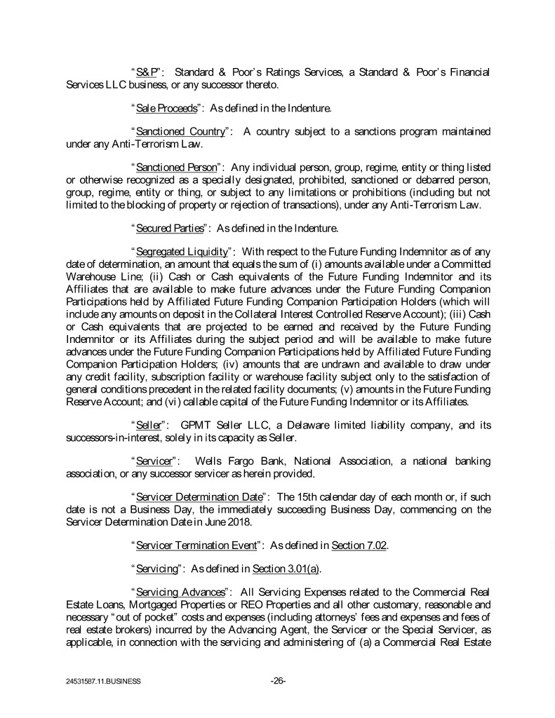 “S&P”: Standard & Poor’s Ratings Services, a Standard & Poor’s Financial Services LLC business, or any successor thereto. “Sale Proceeds”: As defined in the Indenture. “Sanctioned Country”: A country subject to a sanctions program maintained under any Anti-Terrorism Law. “Sanctioned Person”: Any individual person, group, regime, entity or thing listed or otherwise recognized as a specially designated, prohibited, sanctioned or debarred person, group, regime, entity or thing, or subject to any limitations or prohibitions (including but not limited to the blocking of property or rejection of transactions), under any Anti-Terrorism Law. “Secured Parties”: As defined in the Indenture. “Segregated Liquidity”: With respect to the Future Funding Indemnitor as of any date of determination, an amount that equals the sum of (i) amounts available under a Committed Warehouse Line; (ii) Cash or Cash equivalents of the Future Funding Indemnitor and its Affiliates that are available to make future advances under the Future Funding Companion Participations held by Affiliated Future Funding Companion Participation Holders (which will include any amounts on deposit in the Collateral Interest Controlled Reserve Account); (iii) Cash or Cash equivalents that are projected to be earned and received by the Future Funding Indemnitor or its Affiliates during the subject period and will be available to make future advances under the Future Funding Companion Participations held by Affiliated Future Funding Companion Participation Holders; (iv) amounts that are undrawn and available to draw under any credit facility, subscription facility or warehouse facility subject only to the satisfaction of general conditions precedent in the related facility documents; (v) amounts in the Future Funding Reserve Account; and (vi) callable capital of the Future Funding Indemnitor or its Affiliates. “Seller”: GPMT Seller LLC, a Delaware limited liability company, and its successors-in-interest, solely in its capacity as Seller. “Servicer”: Wells Fargo Bank, National Association, a national banking association, or any successor servicer as herein provided. “Servicer Determination Date”: The 15th calendar day of each month or, if such date is not a Business Day, the immediately succeeding Business Day, commencing on the Servicer Determination Date in June 2018. “Servicer Termination Event”: As defined in Section 7.02. “Servicing”: As defined in Section 3.01(a). “Servicing Advances”: All Servicing Expenses related to the Commercial Real Estate Loans, Mortgaged Properties or REO Properties and all other customary, reasonable and necessary “out of pocket” costs and expenses (including attorneys’ fees and expenses and fees of real estate brokers) incurred by the Advancing Agent, the Servicer or the Special Servicer, as applicable, in connection with the servicing and administering of (a) a Commercial Real Estate 24531587.11.BUSINESS -26-