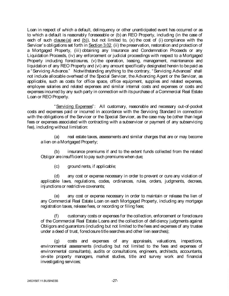 Loan in respect of which a default, delinquency or other unanticipated event has occurred or as to which a default is reasonably foreseeable or (b) an REO Property, including (in the case of each of such clause (a) and (b)), but not limited to, (x) the cost of (i) compliance with the Servicer’s obligations set forth in Section 3.02, (ii) the preservation, restoration and protection of a Mortgaged Property, (iii) obtaining any Insurance and Condemnation Proceeds or any Liquidation Proceeds, (iv) any enforcement or judicial proceedings with respect to a Mortgaged Property including foreclosures, (v) the operation, leasing, management, maintenance and liquidation of any REO Property and (vi) any amount specifically designated herein to be paid as a “Servicing Advance.” Notwithstanding anything to the contrary, “Servicing Advances” shall not include allocable overhead of the Special Servicer, the Advancing Agent or the Servicer, as applicable, such as costs for office space, office equipment, supplies and related expenses, employee salaries and related expenses and similar internal costs and expenses or costs and expenses incurred by any such party in connection with its purchase of a Commercial Real Estate Loan or REO Property. “Servicing Expenses”: All customary, reasonable and necessary out-of-pocket costs and expenses paid or incurred in accordance with the Servicing Standard in connection with the obligations of the Servicer or the Special Servicer, as the case may be (other than legal fees or expenses associated with contracting with a subservicer or payment of any subservicing fee), including without limitation: (a) real estate taxes, assessments and similar charges that are or may become a lien on a Mortgaged Property; (b) insurance premiums if and to the extent funds collected from the related Obligor are insufficient to pay such premiums when due; (c) ground rents, if applicable; (d) any cost or expense necessary in order to prevent or cure any violation of applicable laws, regulations, codes, ordinances, rules, orders, judgments, decrees, injunctions or restrictive covenants; (e) any cost or expense necessary in order to maintain or release the lien of any Commercial Real Estate Loan on each Mortgaged Property, including any mortgage registration taxes, release fees, or recording or filing fees; (f) customary costs or expenses for the collection, enforcement or foreclosure of the Commercial Real Estate Loans and the collection of deficiency judgments against Obligors and guarantors (including but not limited to the fees and expenses of any trustee under a deed of trust, foreclosure title searches and other lien searches); (g) costs and expenses of any appraisals, valuations, inspections, environmental assessments (including but not limited to the fees and expenses of environmental consultants), audits or consultations, engineers, architects, accountants, on-site property managers, market studies, title and survey work and financial investigating services; 24531587.11.BUSINESS -27-