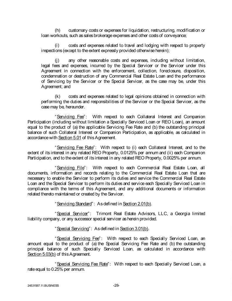 (h) customary costs or expenses for liquidation, restructuring, modification or loan workouts, such as sales brokerage expenses and other costs of conveyance; (i) costs and expenses related to travel and lodging with respect to property inspections (except to the extent expressly provided otherwise herein); (j) any other reasonable costs and expenses, including without limitation, legal fees and expenses, incurred by the Special Servicer or the Servicer under this Agreement in connection with the enforcement, collection, foreclosure, disposition, condemnation or destruction of any Commercial Real Estate Loan and the performance of Servicing by the Servicer or the Special Servicer, as the case may be, under this Agreement; and (k) costs and expenses related to legal opinions obtained in connection with performing the duties and responsibilities of the Servicer or the Special Servicer, as the case may be, hereunder. “Servicing Fee”: With respect to each Collateral Interest and Companion Participation (including without limitation a Specially Serviced Loan or REO Loan), an amount equal to the product of (a) the applicable Servicing Fee Rate and (b) the outstanding principal balance of such Collateral Interest or Companion Participation, as applicable, as calculated in accordance with Section 5.01 of this Agreement. “Servicing Fee Rate”: With respect to (i) each Collateral Interest, and to the extent of its interest in any related REO Property, 0.0125% per annum and (ii) each Companion Participation, and to the extent of its interest in any related REO Property, 0.0025% per annum. “Servicing File”: With respect to each Commercial Real Estate Loan, all documents, information and records relating to the Commercial Real Estate Loan that are necessary to enable the Servicer to perform its duties and service the Commercial Real Estate Loan and the Special Servicer to perform its duties and service each Specially Serviced Loan in compliance with the terms of this Agreement, and any additional documents or information related thereto maintained or created by the Servicer. “Servicing Standard”: As defined in Section 2.01(b). “Special Servicer”: Trimont Real Estate Advisors, LLC, a Georgia limited liability company, or any successor special servicer as herein provided. “Special Servicing”: As defined in Section 3.01(b). “Special Servicing Fee”: With respect to each Specially Serviced Loan, an amount equal to the product of (a) the Special Servicing Fee Rate and (b) the outstanding principal balance of such Specially Serviced Loan, as calculated in accordance with Section 5.03(b) of this Agreement. “Special Servicing Fee Rate”: With respect to each Specially Serviced Loan, a rate equal to 0.25% per annum. 24531587.11.BUSINESS -28-