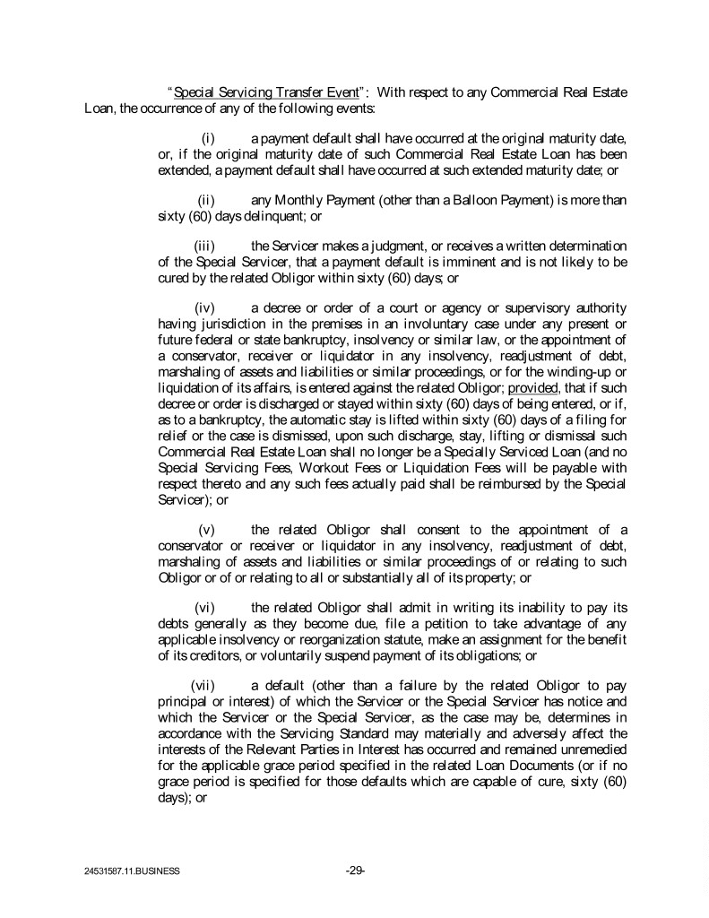 “Special Servicing Transfer Event”: With respect to any Commercial Real Estate Loan, the occurrence of any of the following events: (i) a payment default shall have occurred at the original maturity date, or, if the original maturity date of such Commercial Real Estate Loan has been extended, a payment default shall have occurred at such extended maturity date; or (ii) any Monthly Payment (other than a Balloon Payment) is more than sixty (60) days delinquent; or (iii) the Servicer makes a judgment, or receives a written determination of the Special Servicer, that a payment default is imminent and is not likely to be cured by the related Obligor within sixty (60) days; or (iv) a decree or order of a court or agency or supervisory authority having jurisdiction in the premises in an involuntary case under any present or future federal or state bankruptcy, insolvency or similar law, or the appointment of a conservator, receiver or liquidator in any insolvency, readjustment of debt, marshaling of assets and liabilities or similar proceedings, or for the winding-up or liquidation of its affairs, is entered against the related Obligor; provided, that if such decree or order is discharged or stayed within sixty (60) days of being entered, or if, as to a bankruptcy, the automatic stay is lifted within sixty (60) days of a filing for relief or the case is dismissed, upon such discharge, stay, lifting or dismissal such Commercial Real Estate Loan shall no longer be a Specially Serviced Loan (and no Special Servicing Fees, Workout Fees or Liquidation Fees will be payable with respect thereto and any such fees actually paid shall be reimbursed by the Special Servicer); or (v) the related Obligor shall consent to the appointment of a conservator or receiver or liquidator in any insolvency, readjustment of debt, marshaling of assets and liabilities or similar proceedings of or relating to such Obligor or of or relating to all or substantially all of its property; or (vi) the related Obligor shall admit in writing its inability to pay its debts generally as they become due, file a petition to take advantage of any applicable insolvency or reorganization statute, make an assignment for the benefit of its creditors, or voluntarily suspend payment of its obligations; or (vii) a default (other than a failure by the related Obligor to pay principal or interest) of which the Servicer or the Special Servicer has notice and which the Servicer or the Special Servicer, as the case may be, determines in accordance with the Servicing Standard may materially and adversely affect the interests of the Relevant Parties in Interest has occurred and remained unremedied for the applicable grace period specified in the related Loan Documents (or if no grace period is specified for those defaults which are capable of cure, sixty (60) days); or 24531587.11.BUSINESS -29-