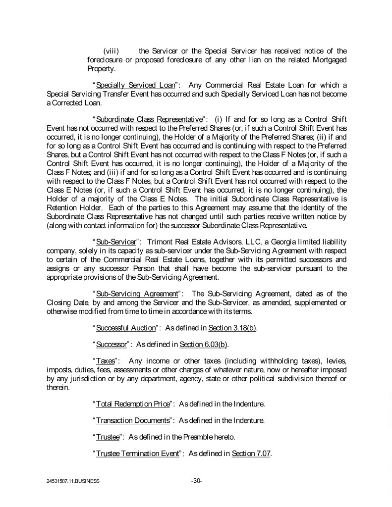 (viii) the Servicer or the Special Servicer has received notice of the foreclosure or proposed foreclosure of any other lien on the related Mortgaged Property. “Specially Serviced Loan”: Any Commercial Real Estate Loan for which a Special Servicing Transfer Event has occurred and such Specially Serviced Loan has not become a Corrected Loan. “Subordinate Class Representative”: (i) If and for so long as a Control Shift Event has not occurred with respect to the Preferred Shares (or, if such a Control Shift Event has occurred, it is no longer continuing), the Holder of a Majority of the Preferred Shares; (ii) if and for so long as a Control Shift Event has occurred and is continuing with respect to the Preferred Shares, but a Control Shift Event has not occurred with respect to the Class F Notes (or, if such a Control Shift Event has occurred, it is no longer continuing), the Holder of a Majority of the Class F Notes; and (iii) if and for so long as a Control Shift Event has occurred and is continuing with respect to the Class F Notes, but a Control Shift Event has not occurred with respect to the Class E Notes (or, if such a Control Shift Event has occurred, it is no longer continuing), the Holder of a majority of the Class E Notes. The initial Subordinate Class Representative is Retention Holder. Each of the parties to this Agreement may assume that the identity of the Subordinate Class Representative has not changed until such parties receive written notice by (along with contact information for) the successor Subordinate Class Representative. “Sub-Servicer”: Trimont Real Estate Advisors, LLC, a Georgia limited liability company, solely in its capacity as sub-servicer under the Sub-Servicing Agreement with respect to certain of the Commercial Real Estate Loans, together with its permitted successors and assigns or any successor Person that shall have become the sub-servicer pursuant to the appropriate provisions of the Sub-Servicing Agreement. “Sub-Servicing Agreement”: The Sub-Servicing Agreement, dated as of the Closing Date, by and among the Servicer and the Sub-Servicer, as amended, supplemented or otherwise modified from time to time in accordance with its terms. “Successful Auction”: As defined in Section 3.18(b). “Successor”: As defined in Section 6.03(b). “Taxes”: Any income or other taxes (including withholding taxes), levies, imposts, duties, fees, assessments or other charges of whatever nature, now or hereafter imposed by any jurisdiction or by any department, agency, state or other political subdivision thereof or therein. “Total Redemption Price”: As defined in the Indenture. “Transaction Documents”: As defined in the Indenture. “Trustee”: As defined in the Preamble hereto. “Trustee Termination Event”: As defined in Section 7.07. 24531587.11.BUSINESS -30-