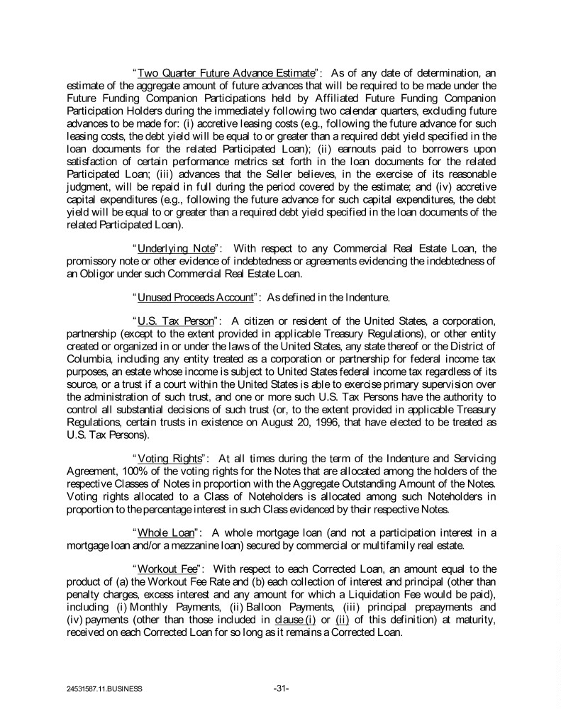 “Two Quarter Future Advance Estimate”: As of any date of determination, an estimate of the aggregate amount of future advances that will be required to be made under the Future Funding Companion Participations held by Affiliated Future Funding Companion Participation Holders during the immediately following two calendar quarters, excluding future advances to be made for: (i) accretive leasing costs (e.g., following the future advance for such leasing costs, the debt yield will be equal to or greater than a required debt yield specified in the loan documents for the related Participated Loan); (ii) earnouts paid to borrowers upon satisfaction of certain performance metrics set forth in the loan documents for the related Participated Loan; (iii) advances that the Seller believes, in the exercise of its reasonable judgment, will be repaid in full during the period covered by the estimate; and (iv) accretive capital expenditures (e.g., following the future advance for such capital expenditures, the debt yield will be equal to or greater than a required debt yield specified in the loan documents of the related Participated Loan). “Underlying Note”: With respect to any Commercial Real Estate Loan, the promissory note or other evidence of indebtedness or agreements evidencing the indebtedness of an Obligor under such Commercial Real Estate Loan. “Unused Proceeds Account”: As defined in the Indenture. “U.S. Tax Person”: A citizen or resident of the United States, a corporation, partnership (except to the extent provided in applicable Treasury Regulations), or other entity created or organized in or under the laws of the United States, any state thereof or the District of Columbia, including any entity treated as a corporation or partnership for federal income tax purposes, an estate whose income is subject to United States federal income tax regardless of its source, or a trust if a court within the United States is able to exercise primary supervision over the administration of such trust, and one or more such U.S. Tax Persons have the authority to control all substantial decisions of such trust (or, to the extent provided in applicable Treasury Regulations, certain trusts in existence on August 20, 1996, that have elected to be treated as U.S. Tax Persons). “Voting Rights”: At all times during the term of the Indenture and Servicing Agreement, 100% of the voting rights for the Notes that are allocated among the holders of the respective Classes of Notes in proportion with the Aggregate Outstanding Amount of the Notes. Voting rights allocated to a Class of Noteholders is allocated among such Noteholders in proportion to the percentage interest in such Class evidenced by their respective Notes. “Whole Loan”: A whole mortgage loan (and not a participation interest in a mortgage loan and/or a mezzanine loan) secured by commercial or multifamily real estate. “Workout Fee”: With respect to each Corrected Loan, an amount equal to the product of (a) the Workout Fee Rate and (b) each collection of interest and principal (other than penalty charges, excess interest and any amount for which a Liquidation Fee would be paid), including (i) Monthly Payments, (ii) Balloon Payments, (iii) principal prepayments and (iv) payments (other than those included in clause (i) or (ii) of this definition) at maturity, received on each Corrected Loan for so long as it remains a Corrected Loan. 24531587.11.BUSINESS -31-