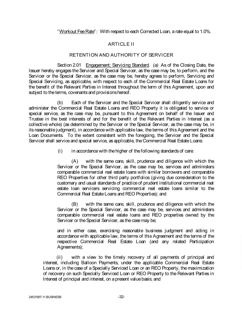 “Workout Fee Rate”: With respect to each Corrected Loan, a rate equal to 1.0%. ARTICLE II RETENTION AND AUTHORITY OF SERVICER Section 2.01 Engagement; Servicing Standard. (a) As of the Closing Date, the Issuer hereby engages the Servicer and Special Servicer, as the case may be, to perform, and the Servicer or the Special Servicer, as the case may be, hereby agrees to perform, Servicing and Special Servicing, as applicable, with respect to each of the Commercial Real Estate Loans for the benefit of the Relevant Parties in Interest throughout the term of this Agreement, upon and subject to the terms, covenants and provisions hereof. (b) Each of the Servicer and the Special Servicer shall diligently service and administer the Commercial Real Estate Loans and REO Property it is obligated to service or special service, as the case may be, pursuant to this Agreement on behalf of the Issuer and Trustee in the best interests of and for the benefit of the Relevant Parties in Interest (as a collective whole) (as determined by the Servicer or the Special Servicer, as the case may be, in its reasonable judgment), in accordance with applicable law, the terms of this Agreement and the Loan Documents. To the extent consistent with the foregoing, the Servicer and the Special Servicer shall service and special service, as applicable, the Commercial Real Estate Loans: (i) in accordance with the higher of the following standards of care: (A) with the same care, skill, prudence and diligence with which the Servicer or the Special Servicer, as the case may be, services and administers comparable commercial real estate loans with similar borrowers and comparable REO Properties for other third party portfolios (giving due consideration to the customary and usual standards of practice of prudent institutional commercial real estate loan servicers servicing commercial real estate loans similar to the Commercial Real Estate Loans and REO Properties); and (B) with the same care, skill, prudence and diligence with which the Servicer or the Special Servicer, as the case may be, services and administers comparable commercial real estate loans and REO properties owned by the Servicer or the Special Servicer, as the case may be; and in either case, exercising reasonable business judgment and acting in accordance with applicable law, the terms of this Agreement and the terms of the respective Commercial Real Estate Loan (and any related Participation Agreements); (ii) with a view to the timely recovery of all payments of principal and interest, including Balloon Payments, under the applicable Commercial Real Estate Loans or, in the case of a Specially Serviced Loan or an REO Property, the maximization of recovery on such Specially Serviced Loan or REO Property to the Relevant Parties in Interest of principal and interest, on a present value basis; and 24531587.11.BUSINESS -32-