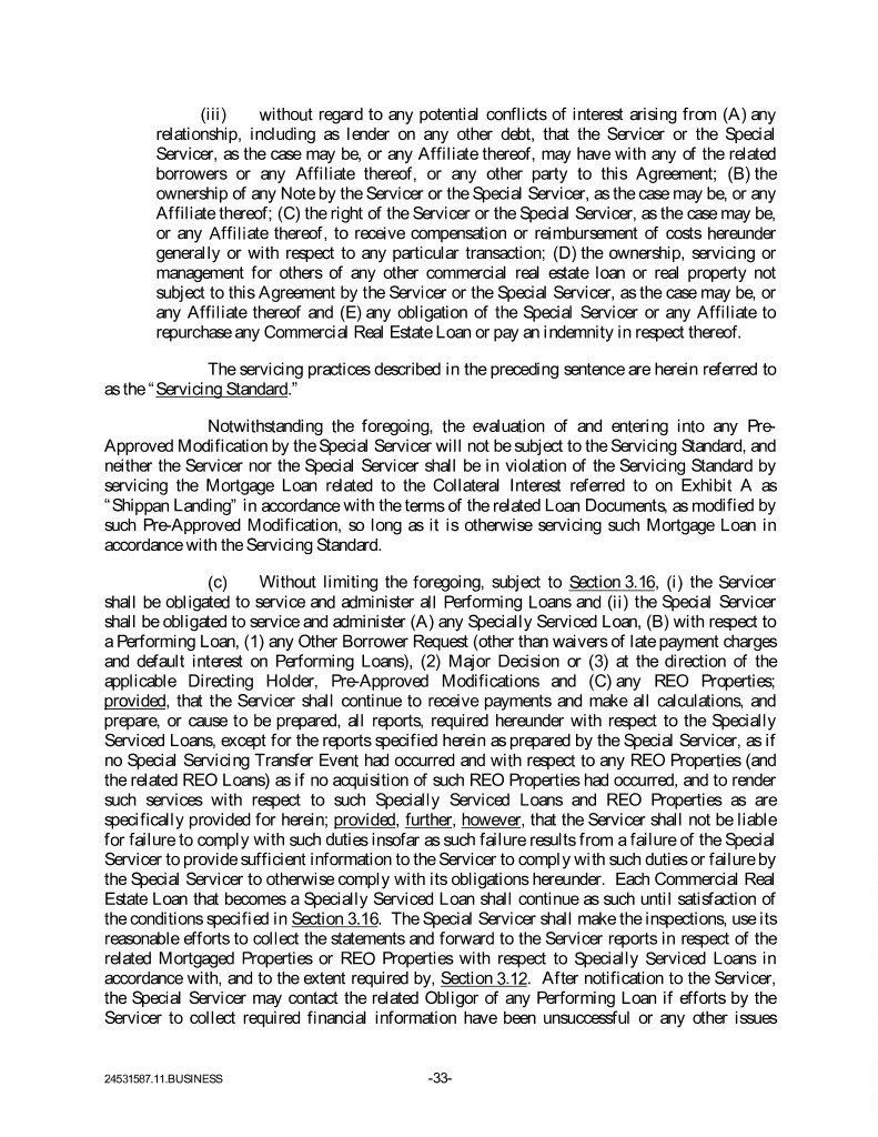 (iii) without regard to any potential conflicts of interest arising from (A) any relationship, including as lender on any other debt, that the Servicer or the Special Servicer, as the case may be, or any Affiliate thereof, may have with any of the related borrowers or any Affiliate thereof, or any other party to this Agreement; (B) the ownership of any Note by the Servicer or the Special Servicer, as the case may be, or any Affiliate thereof; (C) the right of the Servicer or the Special Servicer, as the case may be, or any Affiliate thereof, to receive compensation or reimbursement of costs hereunder generally or with respect to any particular transaction; (D) the ownership, servicing or management for others of any other commercial real estate loan or real property not subject to this Agreement by the Servicer or the Special Servicer, as the case may be, or any Affiliate thereof and (E) any obligation of the Special Servicer or any Affiliate to repurchase any Commercial Real Estate Loan or pay an indemnity in respect thereof. The servicing practices described in the preceding sentence are herein referred to as the “Servicing Standard.” Notwithstanding the foregoing, the evaluation of and entering into any Pre- Approved Modification by the Special Servicer will not be subject to the Servicing Standard, and neither the Servicer nor the Special Servicer shall be in violation of the Servicing Standard by servicing the Mortgage Loan related to the Collateral Interest referred to on Exhibit A as “Shippan Landing” in accordance with the terms of the related Loan Documents, as modified by such Pre-Approved Modification, so long as it is otherwise servicing such Mortgage Loan in accordance with the Servicing Standard. (c) Without limiting the foregoing, subject to Section 3.16, (i) the Servicer shall be obligated to service and administer all Performing Loans and (ii) the Special Servicer shall be obligated to service and administer (A) any Specially Serviced Loan, (B) with respect to a Performing Loan, (1) any Other Borrower Request (other than waivers of late payment charges and default interest on Performing Loans), (2) Major Decision or (3) at the direction of the applicable Directing Holder, Pre-Approved Modifications and (C) any REO Properties; provided, that the Servicer shall continue to receive payments and make all calculations, and prepare, or cause to be prepared, all reports, required hereunder with respect to the Specially Serviced Loans, except for the reports specified herein as prepared by the Special Servicer, as if no Special Servicing Transfer Event had occurred and with respect to any REO Properties (and the related REO Loans) as if no acquisition of such REO Properties had occurred, and to render such services with respect to such Specially Serviced Loans and REO Properties as are specifically provided for herein; provided, further, however, that the Servicer shall not be liable for failure to comply with such duties insofar as such failure results from a failure of the Special Servicer to provide sufficient information to the Servicer to comply with such duties or failure by the Special Servicer to otherwise comply with its obligations hereunder. Each Commercial Real Estate Loan that becomes a Specially Serviced Loan shall continue as such until satisfaction of the conditions specified in Section 3.16. The Special Servicer shall make the inspections, use its reasonable efforts to collect the statements and forward to the Servicer reports in respect of the related Mortgaged Properties or REO Properties with respect to Specially Serviced Loans in accordance with, and to the extent required by, Section 3.12. After notification to the Servicer, the Special Servicer may contact the related Obligor of any Performing Loan if efforts by the Servicer to collect required financial information have been unsuccessful or any other issues 24531587.11.BUSINESS -33-