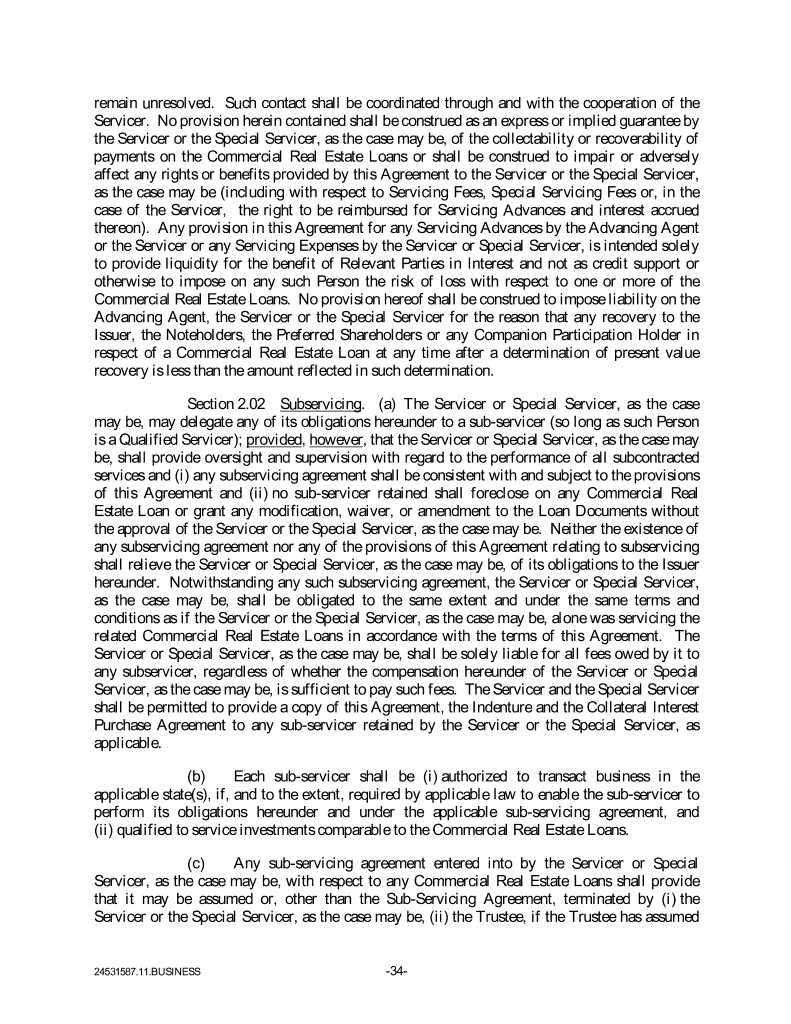 remain unresolved. Such contact shall be coordinated through and with the cooperation of the Servicer. No provision herein contained shall be construed as an express or implied guarantee by the Servicer or the Special Servicer, as the case may be, of the collectability or recoverability of payments on the Commercial Real Estate Loans or shall be construed to impair or adversely affect any rights or benefits provided by this Agreement to the Servicer or the Special Servicer, as the case may be (including with respect to Servicing Fees, Special Servicing Fees or, in the case of the Servicer, the right to be reimbursed for Servicing Advances and interest accrued thereon). Any provision in this Agreement for any Servicing Advances by the Advancing Agent or the Servicer or any Servicing Expenses by the Servicer or Special Servicer, is intended solely to provide liquidity for the benefit of Relevant Parties in Interest and not as credit support or otherwise to impose on any such Person the risk of loss with respect to one or more of the Commercial Real Estate Loans. No provision hereof shall be construed to impose liability on the Advancing Agent, the Servicer or the Special Servicer for the reason that any recovery to the Issuer, the Noteholders, the Preferred Shareholders or any Companion Participation Holder in respect of a Commercial Real Estate Loan at any time after a determination of present value recovery is less than the amount reflected in such determination. Section 2.02 Subservicing. (a) The Servicer or Special Servicer, as the case may be, may delegate any of its obligations hereunder to a sub-servicer (so long as such Person is a Qualified Servicer); provided, however, that the Servicer or Special Servicer, as the case may be, shall provide oversight and supervision with regard to the performance of all subcontracted services and (i) any subservicing agreement shall be consistent with and subject to the provisions of this Agreement and (ii) no sub-servicer retained shall foreclose on any Commercial Real Estate Loan or grant any modification, waiver, or amendment to the Loan Documents without the approval of the Servicer or the Special Servicer, as the case may be. Neither the existence of any subservicing agreement nor any of the provisions of this Agreement relating to subservicing shall relieve the Servicer or Special Servicer, as the case may be, of its obligations to the Issuer hereunder. Notwithstanding any such subservicing agreement, the Servicer or Special Servicer, as the case may be, shall be obligated to the same extent and under the same terms and conditions as if the Servicer or the Special Servicer, as the case may be, alone was servicing the related Commercial Real Estate Loans in accordance with the terms of this Agreement. The Servicer or Special Servicer, as the case may be, shall be solely liable for all fees owed by it to any subservicer, regardless of whether the compensation hereunder of the Servicer or Special Servicer, as the case may be, is sufficient to pay such fees. The Servicer and the Special Servicer shall be permitted to provide a copy of this Agreement, the Indenture and the Collateral Interest Purchase Agreement to any sub-servicer retained by the Servicer or the Special Servicer, as applicable. (b) Each sub-servicer shall be (i) authorized to transact business in the applicable state(s), if, and to the extent, required by applicable law to enable the sub-servicer to perform its obligations hereunder and under the applicable sub-servicing agreement, and (ii) qualified to service investments comparable to the Commercial Real Estate Loans. (c) Any sub-servicing agreement entered into by the Servicer or Special Servicer, as the case may be, with respect to any Commercial Real Estate Loans shall provide that it may be assumed or, other than the Sub-Servicing Agreement, terminated by (i) the Servicer or the Special Servicer, as the case may be, (ii) the Trustee, if the Trustee has assumed 24531587.11.BUSINESS -34-