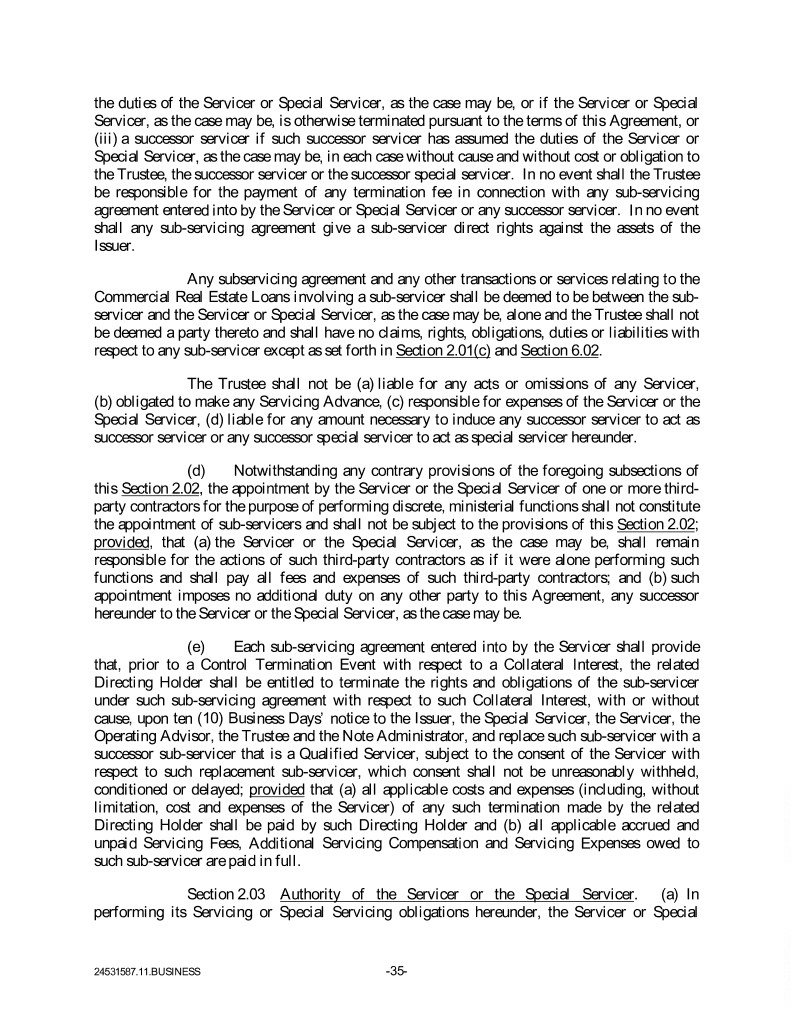 the duties of the Servicer or Special Servicer, as the case may be, or if the Servicer or Special Servicer, as the case may be, is otherwise terminated pursuant to the terms of this Agreement, or (iii) a successor servicer if such successor servicer has assumed the duties of the Servicer or Special Servicer, as the case may be, in each case without cause and without cost or obligation to the Trustee, the successor servicer or the successor special servicer. In no event shall the Trustee be responsible for the payment of any termination fee in connection with any sub-servicing agreement entered into by the Servicer or Special Servicer or any successor servicer. In no event shall any sub-servicing agreement give a sub-servicer direct rights against the assets of the Issuer. Any subservicing agreement and any other transactions or services relating to the Commercial Real Estate Loans involving a sub-servicer shall be deemed to be between the sub- servicer and the Servicer or Special Servicer, as the case may be, alone and the Trustee shall not be deemed a party thereto and shall have no claims, rights, obligations, duties or liabilities with respect to any sub-servicer except as set forth in Section 2.01(c) and Section 6.02. The Trustee shall not be (a) liable for any acts or omissions of any Servicer, (b) obligated to make any Servicing Advance, (c) responsible for expenses of the Servicer or the Special Servicer, (d) liable for any amount necessary to induce any successor servicer to act as successor servicer or any successor special servicer to act as special servicer hereunder. (d) Notwithstanding any contrary provisions of the foregoing subsections of this Section 2.02, the appointment by the Servicer or the Special Servicer of one or more third- party contractors for the purpose of performing discrete, ministerial functions shall not constitute the appointment of sub-servicers and shall not be subject to the provisions of this Section 2.02; provided, that (a) the Servicer or the Special Servicer, as the case may be, shall remain responsible for the actions of such third-party contractors as if it were alone performing such functions and shall pay all fees and expenses of such third-party contractors; and (b) such appointment imposes no additional duty on any other party to this Agreement, any successor hereunder to the Servicer or the Special Servicer, as the case may be. (e) Each sub-servicing agreement entered into by the Servicer shall provide that, prior to a Control Termination Event with respect to a Collateral Interest, the related Directing Holder shall be entitled to terminate the rights and obligations of the sub-servicer under such sub-servicing agreement with respect to such Collateral Interest, with or without cause, upon ten (10) Business Days’ notice to the Issuer, the Special Servicer, the Servicer, the Operating Advisor, the Trustee and the Note Administrator, and replace such sub-servicer with a successor sub-servicer that is a Qualified Servicer, subject to the consent of the Servicer with respect to such replacement sub-servicer, which consent shall not be unreasonably withheld, conditioned or delayed; provided that (a) all applicable costs and expenses (including, without limitation, cost and expenses of the Servicer) of any such termination made by the related Directing Holder shall be paid by such Directing Holder and (b) all applicable accrued and unpaid Servicing Fees, Additional Servicing Compensation and Servicing Expenses owed to such sub-servicer are paid in full. Section 2.03 Authority of the Servicer or the Special Servicer. (a) In performing its Servicing or Special Servicing obligations hereunder, the Servicer or Special 24531587.11.BUSINESS -35-