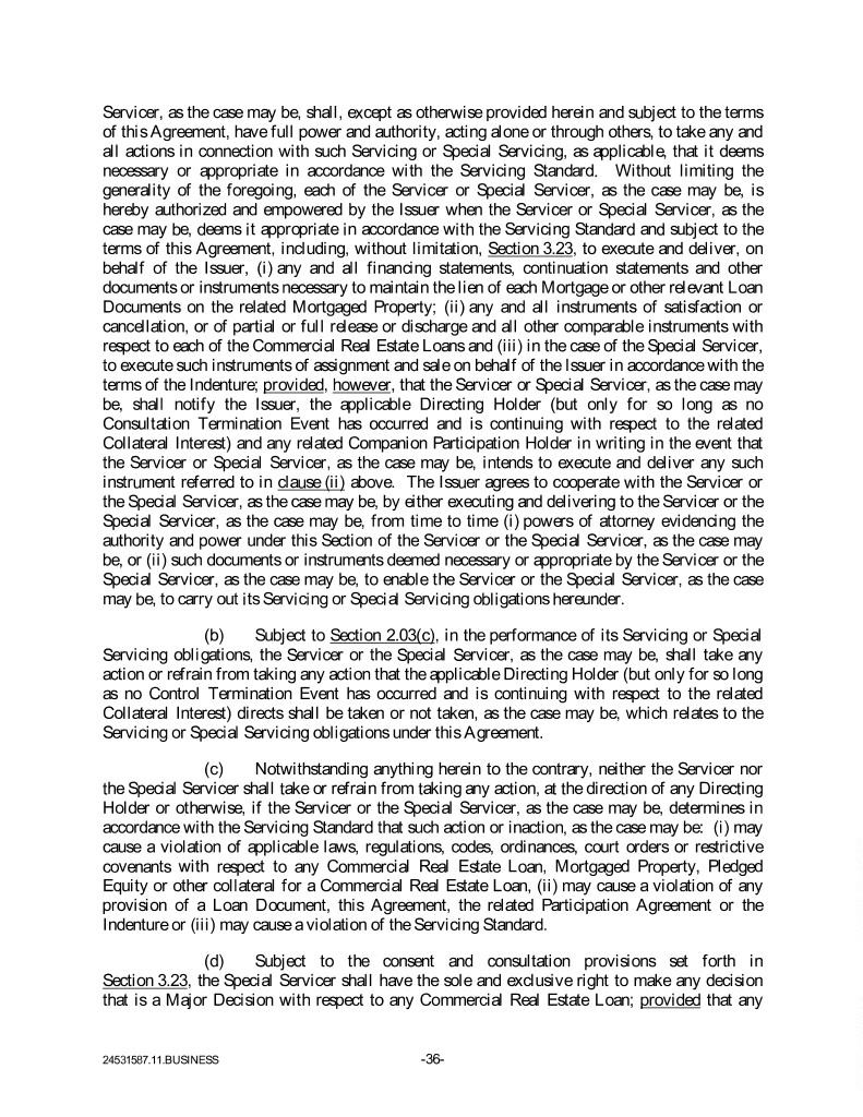 Servicer, as the case may be, shall, except as otherwise provided herein and subject to the terms of this Agreement, have full power and authority, acting alone or through others, to take any and all actions in connection with such Servicing or Special Servicing, as applicable, that it deems necessary or appropriate in accordance with the Servicing Standard. Without limiting the generality of the foregoing, each of the Servicer or Special Servicer, as the case may be, is hereby authorized and empowered by the Issuer when the Servicer or Special Servicer, as the case may be, deems it appropriate in accordance with the Servicing Standard and subject to the terms of this Agreement, including, without limitation, Section 3.23, to execute and deliver, on behalf of the Issuer, (i) any and all financing statements, continuation statements and other documents or instruments necessary to maintain the lien of each Mortgage or other relevant Loan Documents on the related Mortgaged Property; (ii) any and all instruments of satisfaction or cancellation, or of partial or full release or discharge and all other comparable instruments with respect to each of the Commercial Real Estate Loans and (iii) in the case of the Special Servicer, to execute such instruments of assignment and sale on behalf of the Issuer in accordance with the terms of the Indenture; provided, however, that the Servicer or Special Servicer, as the case may be, shall notify the Issuer, the applicable Directing Holder (but only for so long as no Consultation Termination Event has occurred and is continuing with respect to the related Collateral Interest) and any related Companion Participation Holder in writing in the event that the Servicer or Special Servicer, as the case may be, intends to execute and deliver any such instrument referred to in clause (ii) above. The Issuer agrees to cooperate with the Servicer or the Special Servicer, as the case may be, by either executing and delivering to the Servicer or the Special Servicer, as the case may be, from time to time (i) powers of attorney evidencing the authority and power under this Section of the Servicer or the Special Servicer, as the case may be, or (ii) such documents or instruments deemed necessary or appropriate by the Servicer or the Special Servicer, as the case may be, to enable the Servicer or the Special Servicer, as the case may be, to carry out its Servicing or Special Servicing obligations hereunder. (b) Subject to Section 2.03(c), in the performance of its Servicing or Special Servicing obligations, the Servicer or the Special Servicer, as the case may be, shall take any action or refrain from taking any action that the applicable Directing Holder (but only for so long as no Control Termination Event has occurred and is continuing with respect to the related Collateral Interest) directs shall be taken or not taken, as the case may be, which relates to the Servicing or Special Servicing obligations under this Agreement. (c) Notwithstanding anything herein to the contrary, neither the Servicer nor the Special Servicer shall take or refrain from taking any action, at the direction of any Directing Holder or otherwise, if the Servicer or the Special Servicer, as the case may be, determines in accordance with the Servicing Standard that such action or inaction, as the case may be: (i) may cause a violation of applicable laws, regulations, codes, ordinances, court orders or restrictive covenants with respect to any Commercial Real Estate Loan, Mortgaged Property, Pledged Equity or other collateral for a Commercial Real Estate Loan, (ii) may cause a violation of any provision of a Loan Document, this Agreement, the related Participation Agreement or the Indenture or (iii) may cause a violation of the Servicing Standard. (d) Subject to the consent and consultation provisions set forth in Section 3.23, the Special Servicer shall have the sole and exclusive right to make any decision that is a Major Decision with respect to any Commercial Real Estate Loan; provided that any 24531587.11.BUSINESS -36-