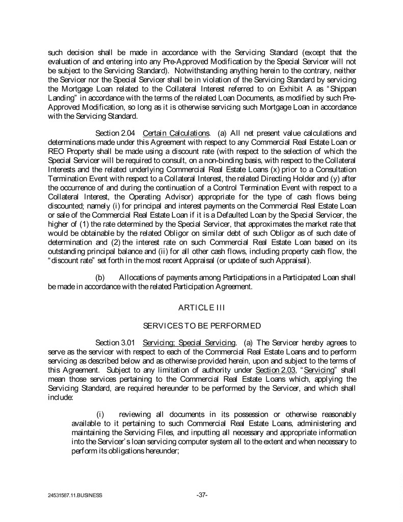 such decision shall be made in accordance with the Servicing Standard (except that the evaluation of and entering into any Pre-Approved Modification by the Special Servicer will not be subject to the Servicing Standard). Notwithstanding anything herein to the contrary, neither the Servicer nor the Special Servicer shall be in violation of the Servicing Standard by servicing the Mortgage Loan related to the Collateral Interest referred to on Exhibit A as “Shippan Landing” in accordance with the terms of the related Loan Documents, as modified by such Pre- Approved Modification, so long as it is otherwise servicing such Mortgage Loan in accordance with the Servicing Standard. Section 2.04 Certain Calculations. (a) All net present value calculations and determinations made under this Agreement with respect to any Commercial Real Estate Loan or REO Property shall be made using a discount rate (with respect to the selection of which the Special Servicer will be required to consult, on a non-binding basis, with respect to the Collateral Interests and the related underlying Commercial Real Estate Loans (x) prior to a Consultation Termination Event with respect to a Collateral Interest, the related Directing Holder and (y) after the occurrence of and during the continuation of a Control Termination Event with respect to a Collateral Interest, the Operating Advisor) appropriate for the type of cash flows being discounted; namely (i) for principal and interest payments on the Commercial Real Estate Loan or sale of the Commercial Real Estate Loan if it is a Defaulted Loan by the Special Servicer, the higher of (1) the rate determined by the Special Servicer, that approximates the market rate that would be obtainable by the related Obligor on similar debt of such Obligor as of such date of determination and (2) the interest rate on such Commercial Real Estate Loan based on its outstanding principal balance and (ii) for all other cash flows, including property cash flow, the “discount rate” set forth in the most recent Appraisal (or update of such Appraisal). (b) Allocations of payments among Participations in a Participated Loan shall be made in accordance with the related Participation Agreement. ARTICLE III SERVICES TO BE PERFORMED Section 3.01 Servicing; Special Servicing. (a) The Servicer hereby agrees to serve as the servicer with respect to each of the Commercial Real Estate Loans and to perform servicing as described below and as otherwise provided herein, upon and subject to the terms of this Agreement. Subject to any limitation of authority under Section 2.03, “Servicing” shall mean those services pertaining to the Commercial Real Estate Loans which, applying the Servicing Standard, are required hereunder to be performed by the Servicer, and which shall include: (i) reviewing all documents in its possession or otherwise reasonably available to it pertaining to such Commercial Real Estate Loans, administering and maintaining the Servicing Files, and inputting all necessary and appropriate information into the Servicer’s loan servicing computer system all to the extent and when necessary to perform its obligations hereunder; 24531587.11.BUSINESS -37-