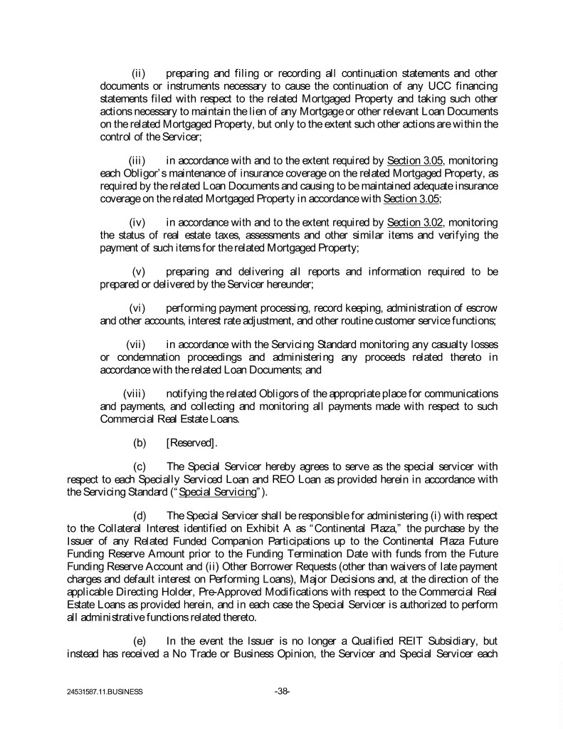 (ii) preparing and filing or recording all continuation statements and other documents or instruments necessary to cause the continuation of any UCC financing statements filed with respect to the related Mortgaged Property and taking such other actions necessary to maintain the lien of any Mortgage or other relevant Loan Documents on the related Mortgaged Property, but only to the extent such other actions are within the control of the Servicer; (iii) in accordance with and to the extent required by Section 3.05, monitoring each Obligor’s maintenance of insurance coverage on the related Mortgaged Property, as required by the related Loan Documents and causing to be maintained adequate insurance coverage on the related Mortgaged Property in accordance with Section 3.05; (iv) in accordance with and to the extent required by Section 3.02, monitoring the status of real estate taxes, assessments and other similar items and verifying the payment of such items for the related Mortgaged Property; (v) preparing and delivering all reports and information required to be prepared or delivered by the Servicer hereunder; (vi) performing payment processing, record keeping, administration of escrow and other accounts, interest rate adjustment, and other routine customer service functions; (vii) in accordance with the Servicing Standard monitoring any casualty losses or condemnation proceedings and administering any proceeds related thereto in accordance with the related Loan Documents; and (viii) notifying the related Obligors of the appropriate place for communications and payments, and collecting and monitoring all payments made with respect to such Commercial Real Estate Loans. (b) [Reserved]. (c) The Special Servicer hereby agrees to serve as the special servicer with respect to each Specially Serviced Loan and REO Loan as provided herein in accordance with the Servicing Standard (“Special Servicing”). (d) The Special Servicer shall be responsible for administering (i) with respect to the Collateral Interest identified on Exhibit A as “Continental Plaza,” the purchase by the Issuer of any Related Funded Companion Participations up to the Continental Plaza Future Funding Reserve Amount prior to the Funding Termination Date with funds from the Future Funding Reserve Account and (ii) Other Borrower Requests (other than waivers of late payment charges and default interest on Performing Loans), Major Decisions and, at the direction of the applicable Directing Holder, Pre-Approved Modifications with respect to the Commercial Real Estate Loans as provided herein, and in each case the Special Servicer is authorized to perform all administrative functions related thereto. (e) In the event the Issuer is no longer a Qualified REIT Subsidiary, but instead has received a No Trade or Business Opinion, the Servicer and Special Servicer each 24531587.11.BUSINESS -38-