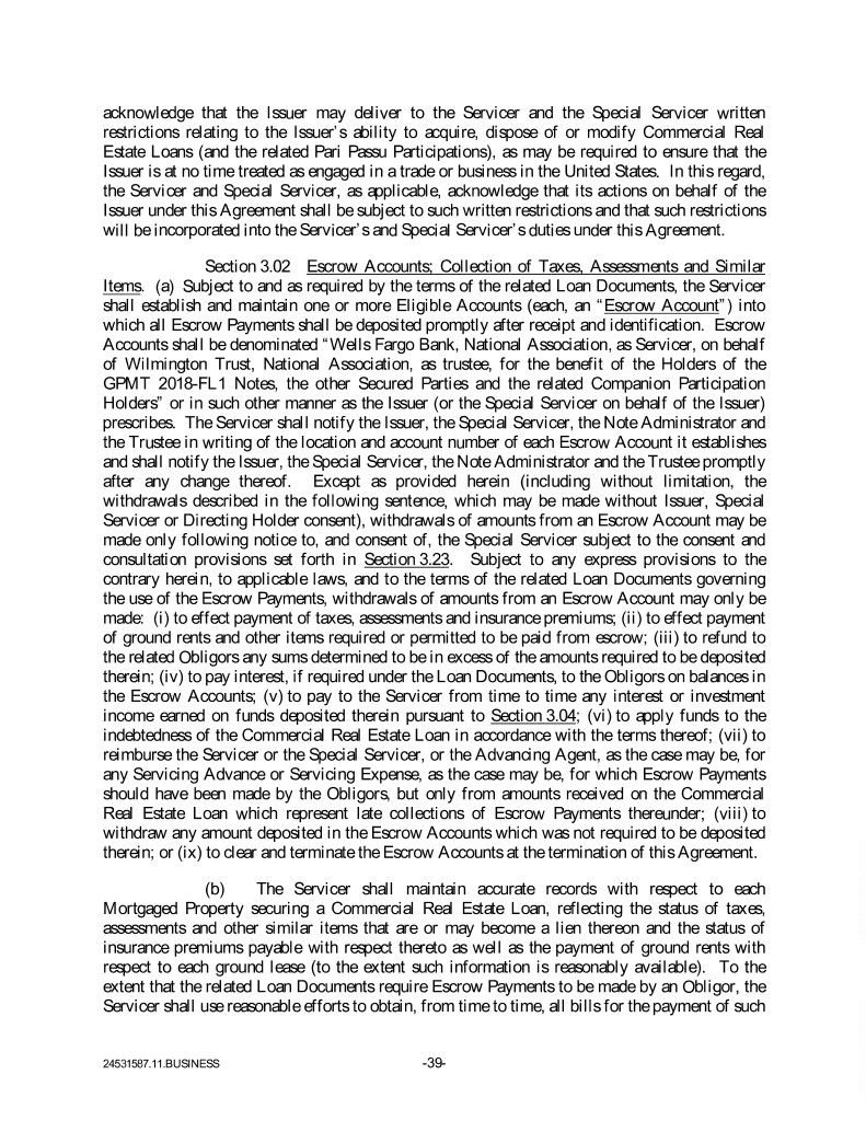 acknowledge that the Issuer may deliver to the Servicer and the Special Servicer written restrictions relating to the Issuer’s ability to acquire, dispose of or modify Commercial Real Estate Loans (and the related Pari Passu Participations), as may be required to ensure that the Issuer is at no time treated as engaged in a trade or business in the United States. In this regard, the Servicer and Special Servicer, as applicable, acknowledge that its actions on behalf of the Issuer under this Agreement shall be subject to such written restrictions and that such restrictions will be incorporated into the Servicer’s and Special Servicer’s duties under this Agreement. Section 3.02 Escrow Accounts; Collection of Taxes, Assessments and Similar Items. (a) Subject to and as required by the terms of the related Loan Documents, the Servicer shall establish and maintain one or more Eligible Accounts (each, an “Escrow Account”) into which all Escrow Payments shall be deposited promptly after receipt and identification. Escrow Accounts shall be denominated “Wells Fargo Bank, National Association, as Servicer, on behalf of Wilmington Trust, National Association, as trustee, for the benefit of the Holders of the GPMT 2018-FL1 Notes, the other Secured Parties and the related Companion Participation Holders” or in such other manner as the Issuer (or the Special Servicer on behalf of the Issuer) prescribes. The Servicer shall notify the Issuer, the Special Servicer, the Note Administrator and the Trustee in writing of the location and account number of each Escrow Account it establishes and shall notify the Issuer, the Special Servicer, the Note Administrator and the Trustee promptly after any change thereof. Except as provided herein (including without limitation, the withdrawals described in the following sentence, which may be made without Issuer, Special Servicer or Directing Holder consent), withdrawals of amounts from an Escrow Account may be made only following notice to, and consent of, the Special Servicer subject to the consent and consultation provisions set forth in Section 3.23. Subject to any express provisions to the contrary herein, to applicable laws, and to the terms of the related Loan Documents governing the use of the Escrow Payments, withdrawals of amounts from an Escrow Account may only be made: (i) to effect payment of taxes, assessments and insurance premiums; (ii) to effect payment of ground rents and other items required or permitted to be paid from escrow; (iii) to refund to the related Obligors any sums determined to be in excess of the amounts required to be deposited therein; (iv) to pay interest, if required under the Loan Documents, to the Obligors on balances in the Escrow Accounts; (v) to pay to the Servicer from time to time any interest or investment income earned on funds deposited therein pursuant to Section 3.04; (vi) to apply funds to the indebtedness of the Commercial Real Estate Loan in accordance with the terms thereof; (vii) to reimburse the Servicer or the Special Servicer, or the Advancing Agent, as the case may be, for any Servicing Advance or Servicing Expense, as the case may be, for which Escrow Payments should have been made by the Obligors, but only from amounts received on the Commercial Real Estate Loan which represent late collections of Escrow Payments thereunder; (viii) to withdraw any amount deposited in the Escrow Accounts which was not required to be deposited therein; or (ix) to clear and terminate the Escrow Accounts at the termination of this Agreement. (b) The Servicer shall maintain accurate records with respect to each Mortgaged Property securing a Commercial Real Estate Loan, reflecting the status of taxes, assessments and other similar items that are or may become a lien thereon and the status of insurance premiums payable with respect thereto as well as the payment of ground rents with respect to each ground lease (to the extent such information is reasonably available). To the extent that the related Loan Documents require Escrow Payments to be made by an Obligor, the Servicer shall use reasonable efforts to obtain, from time to time, all bills for the payment of such 24531587.11.BUSINESS -39-