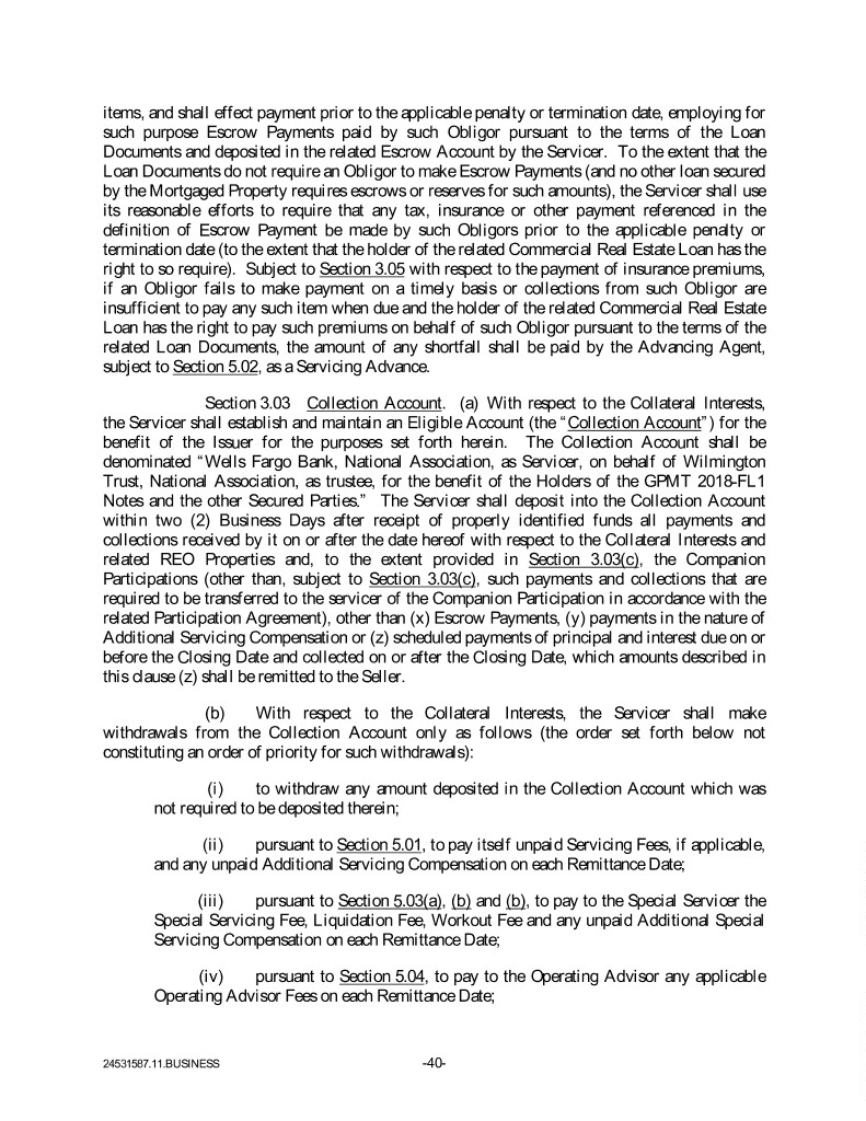 items, and shall effect payment prior to the applicable penalty or termination date, employing for such purpose Escrow Payments paid by such Obligor pursuant to the terms of the Loan Documents and deposited in the related Escrow Account by the Servicer. To the extent that the Loan Documents do not require an Obligor to make Escrow Payments (and no other loan secured by the Mortgaged Property requires escrows or reserves for such amounts), the Servicer shall use its reasonable efforts to require that any tax, insurance or other payment referenced in the definition of Escrow Payment be made by such Obligors prior to the applicable penalty or termination date (to the extent that the holder of the related Commercial Real Estate Loan has the right to so require). Subject to Section 3.05 with respect to the payment of insurance premiums, if an Obligor fails to make payment on a timely basis or collections from such Obligor are insufficient to pay any such item when due and the holder of the related Commercial Real Estate Loan has the right to pay such premiums on behalf of such Obligor pursuant to the terms of the related Loan Documents, the amount of any shortfall shall be paid by the Advancing Agent, subject to Section 5.02, as a Servicing Advance. Section 3.03 Collection Account. (a) With respect to the Collateral Interests, the Servicer shall establish and maintain an Eligible Account (the “Collection Account”) for the benefit of the Issuer for the purposes set forth herein. The Collection Account shall be denominated “Wells Fargo Bank, National Association, as Servicer, on behalf of Wilmington Trust, National Association, as trustee, for the benefit of the Holders of the GPMT 2018-FL1 Notes and the other Secured Parties.” The Servicer shall deposit into the Collection Account within two (2) Business Days after receipt of properly identified funds all payments and collections received by it on or after the date hereof with respect to the Collateral Interests and related REO Properties and, to the extent provided in Section 3.03(c), the Companion Participations (other than, subject to Section 3.03(c), such payments and collections that are required to be transferred to the servicer of the Companion Participation in accordance with the related Participation Agreement), other than (x) Escrow Payments, (y) payments in the nature of Additional Servicing Compensation or (z) scheduled payments of principal and interest due on or before the Closing Date and collected on or after the Closing Date, which amounts described in this clause (z) shall be remitted to the Seller. (b) With respect to the Collateral Interests, the Servicer shall make withdrawals from the Collection Account only as follows (the order set forth below not constituting an order of priority for such withdrawals): (i) to withdraw any amount deposited in the Collection Account which was not required to be deposited therein; (ii) pursuant to Section 5.01, to pay itself unpaid Servicing Fees, if applicable, and any unpaid Additional Servicing Compensation on each Remittance Date; (iii) pursuant to Section 5.03(a), (b) and (b), to pay to the Special Servicer the Special Servicing Fee, Liquidation Fee, Workout Fee and any unpaid Additional Special Servicing Compensation on each Remittance Date; (iv) pursuant to Section 5.04, to pay to the Operating Advisor any applicable Operating Advisor Fees on each Remittance Date; 24531587.11.BUSINESS -40-