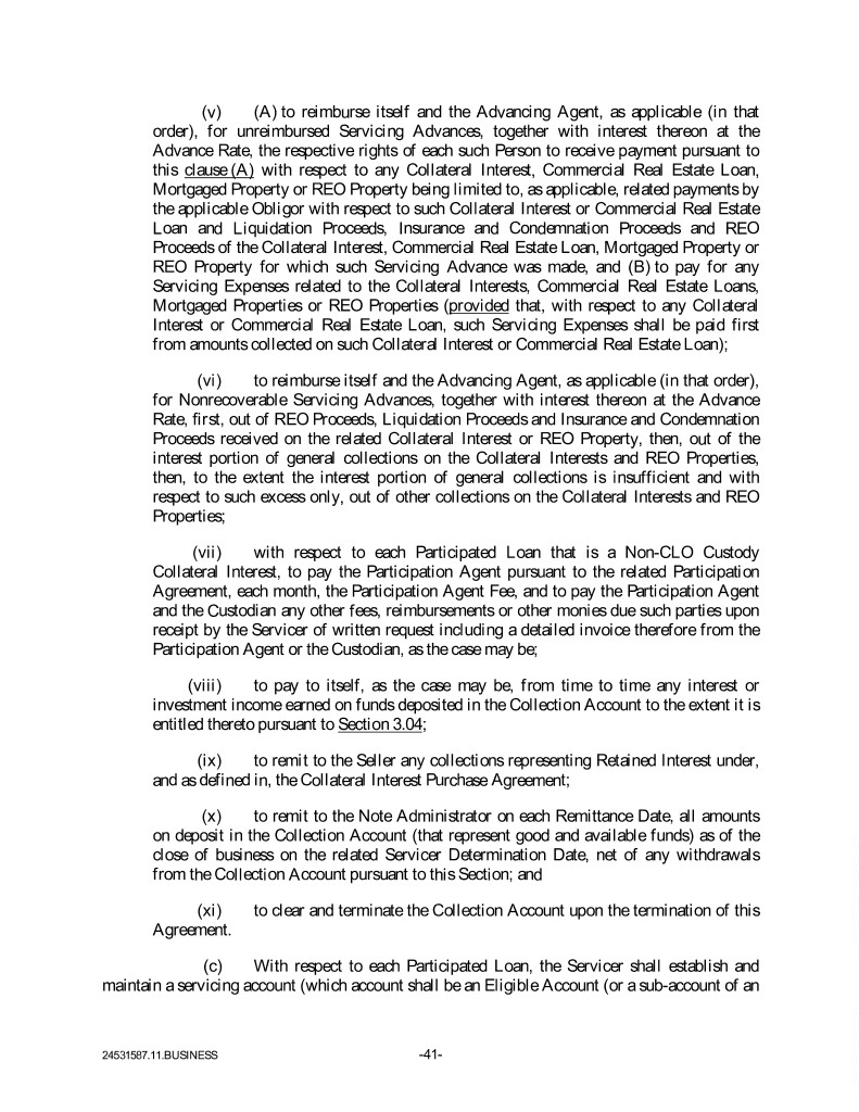 (v) (A) to reimburse itself and the Advancing Agent, as applicable (in that order), for unreimbursed Servicing Advances, together with interest thereon at the Advance Rate, the respective rights of each such Person to receive payment pursuant to this clause (A) with respect to any Collateral Interest, Commercial Real Estate Loan, Mortgaged Property or REO Property being limited to, as applicable, related payments by the applicable Obligor with respect to such Collateral Interest or Commercial Real Estate Loan and Liquidation Proceeds, Insurance and Condemnation Proceeds and REO Proceeds of the Collateral Interest, Commercial Real Estate Loan, Mortgaged Property or REO Property for which such Servicing Advance was made, and (B) to pay for any Servicing Expenses related to the Collateral Interests, Commercial Real Estate Loans, Mortgaged Properties or REO Properties (provided that, with respect to any Collateral Interest or Commercial Real Estate Loan, such Servicing Expenses shall be paid first from amounts collected on such Collateral Interest or Commercial Real Estate Loan); (vi) to reimburse itself and the Advancing Agent, as applicable (in that order), for Nonrecoverable Servicing Advances, together with interest thereon at the Advance Rate, first, out of REO Proceeds, Liquidation Proceeds and Insurance and Condemnation Proceeds received on the related Collateral Interest or REO Property, then, out of the interest portion of general collections on the Collateral Interests and REO Properties, then, to the extent the interest portion of general collections is insufficient and with respect to such excess only, out of other collections on the Collateral Interests and REO Properties; (vii) with respect to each Participated Loan that is a Non-CLO Custody Collateral Interest, to pay the Participation Agent pursuant to the related Participation Agreement, each month, the Participation Agent Fee, and to pay the Participation Agent and the Custodian any other fees, reimbursements or other monies due such parties upon receipt by the Servicer of written request including a detailed invoice therefore from the Participation Agent or the Custodian, as the case may be; (viii) to pay to itself, as the case may be, from time to time any interest or investment income earned on funds deposited in the Collection Account to the extent it is entitled thereto pursuant to Section 3.04; (ix) to remit to the Seller any collections representing Retained Interest under, and as defined in, the Collateral Interest Purchase Agreement; (x) to remit to the Note Administrator on each Remittance Date, all amounts on deposit in the Collection Account (that represent good and available funds) as of the close of business on the related Servicer Determination Date, net of any withdrawals from the Collection Account pursuant to this Section; and (xi) to clear and terminate the Collection Account upon the termination of this Agreement. (c) With respect to each Participated Loan, the Servicer shall establish and maintain a servicing account (which account shall be an Eligible Account (or a sub-account of an 24531587.11.BUSINESS -41-