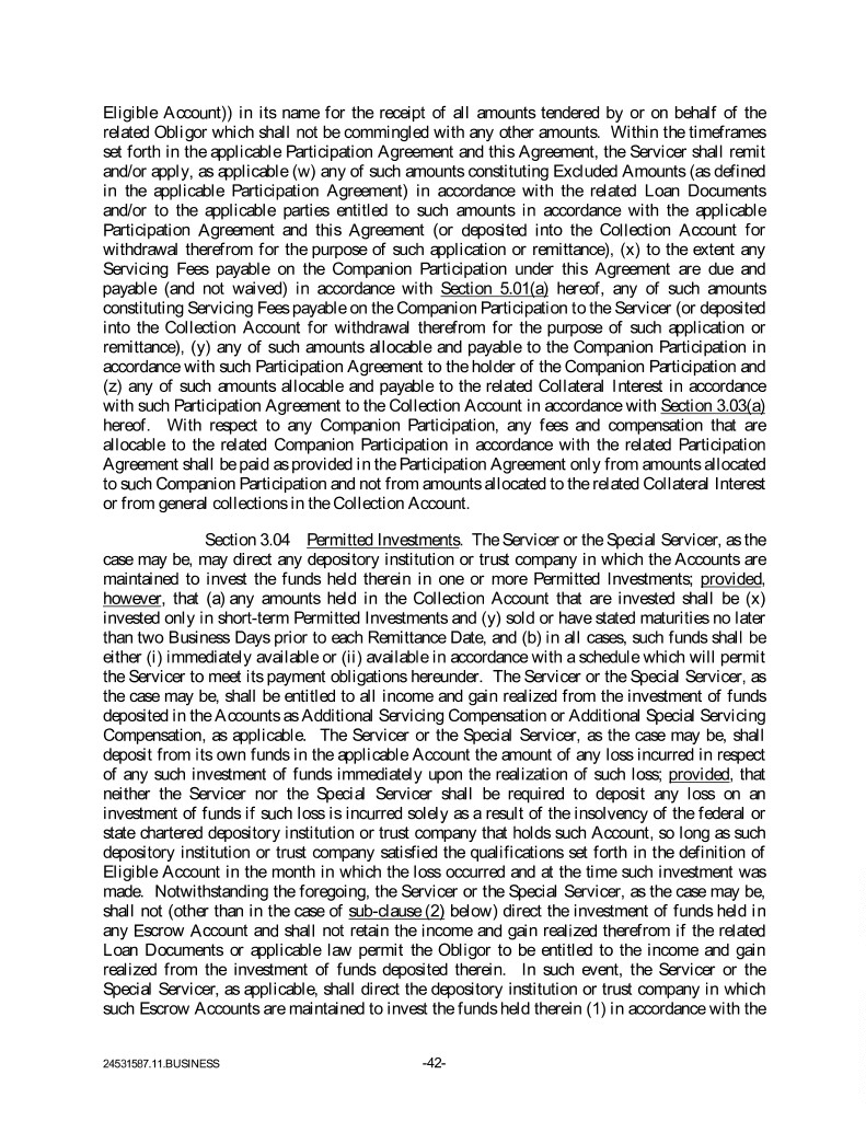 Eligible Account)) in its name for the receipt of all amounts tendered by or on behalf of the related Obligor which shall not be commingled with any other amounts. Within the timeframes set forth in the applicable Participation Agreement and this Agreement, the Servicer shall remit and/or apply, as applicable (w) any of such amounts constituting Excluded Amounts (as defined in the applicable Participation Agreement) in accordance with the related Loan Documents and/or to the applicable parties entitled to such amounts in accordance with the applicable Participation Agreement and this Agreement (or deposited into the Collection Account for withdrawal therefrom for the purpose of such application or remittance), (x) to the extent any Servicing Fees payable on the Companion Participation under this Agreement are due and payable (and not waived) in accordance with Section 5.01(a) hereof, any of such amounts constituting Servicing Fees payable on the Companion Participation to the Servicer (or deposited into the Collection Account for withdrawal therefrom for the purpose of such application or remittance), (y) any of such amounts allocable and payable to the Companion Participation in accordance with such Participation Agreement to the holder of the Companion Participation and (z) any of such amounts allocable and payable to the related Collateral Interest in accordance with such Participation Agreement to the Collection Account in accordance with Section 3.03(a) hereof. With respect to any Companion Participation, any fees and compensation that are allocable to the related Companion Participation in accordance with the related Participation Agreement shall be paid as provided in the Participation Agreement only from amounts allocated to such Companion Participation and not from amounts allocated to the related Collateral Interest or from general collections in the Collection Account. Section 3.04 Permitted Investments. The Servicer or the Special Servicer, as the case may be, may direct any depository institution or trust company in which the Accounts are maintained to invest the funds held therein in one or more Permitted Investments; provided, however, that (a) any amounts held in the Collection Account that are invested shall be (x) invested only in short-term Permitted Investments and (y) sold or have stated maturities no later than two Business Days prior to each Remittance Date, and (b) in all cases, such funds shall be either (i) immediately available or (ii) available in accordance with a schedule which will permit the Servicer to meet its payment obligations hereunder. The Servicer or the Special Servicer, as the case may be, shall be entitled to all income and gain realized from the investment of funds deposited in the Accounts as Additional Servicing Compensation or Additional Special Servicing Compensation, as applicable. The Servicer or the Special Servicer, as the case may be, shall deposit from its own funds in the applicable Account the amount of any loss incurred in respect of any such investment of funds immediately upon the realization of such loss; provided, that neither the Servicer nor the Special Servicer shall be required to deposit any loss on an investment of funds if such loss is incurred solely as a result of the insolvency of the federal or state chartered depository institution or trust company that holds such Account, so long as such depository institution or trust company satisfied the qualifications set forth in the definition of Eligible Account in the month in which the loss occurred and at the time such investment was made. Notwithstanding the foregoing, the Servicer or the Special Servicer, as the case may be, shall not (other than in the case of sub-clause (2) below) direct the investment of funds held in any Escrow Account and shall not retain the income and gain realized therefrom if the related Loan Documents or applicable law permit the Obligor to be entitled to the income and gain realized from the investment of funds deposited therein. In such event, the Servicer or the Special Servicer, as applicable, shall direct the depository institution or trust company in which such Escrow Accounts are maintained to invest the funds held therein (1) in accordance with the 24531587.11.BUSINESS -42-
